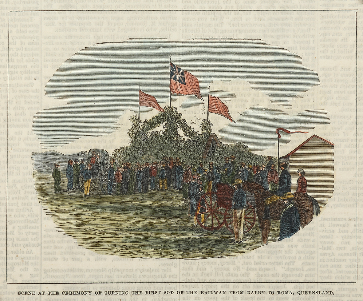 Rare c.19th hand coloured engraving of the opening of the Dalby to Roma railway line.