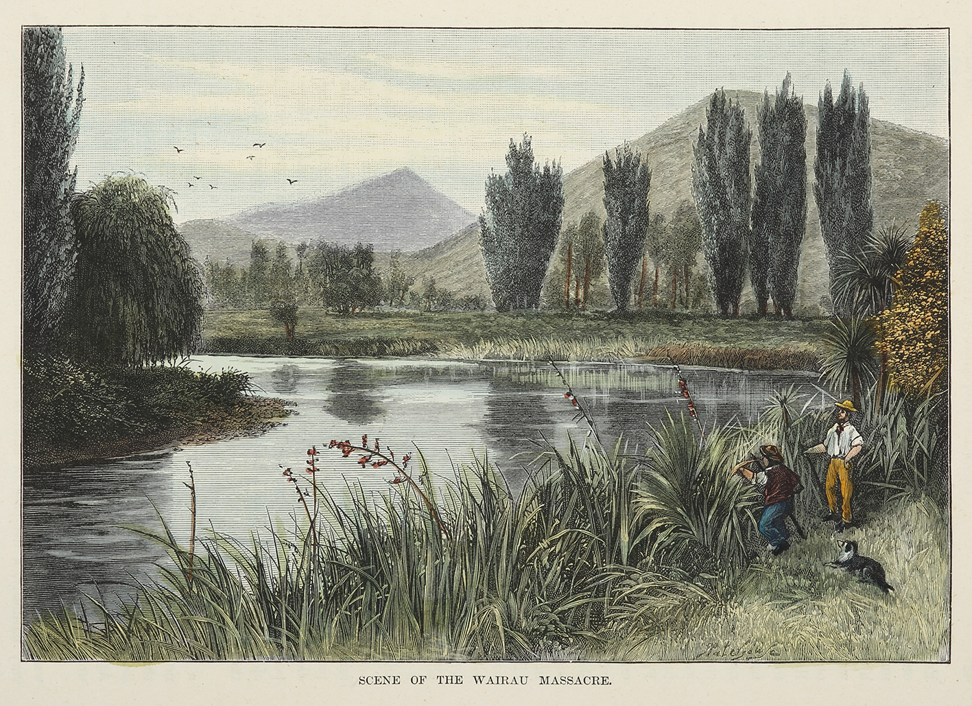 Scarce engraved view of where the Wairau Massacre (Wairau Affray) occurred on 17 June 1843 which was the first serious clash of arms between the Maori and British settlers in New Zealand after the signing of the Treaty of Waitangi … Read Full Description