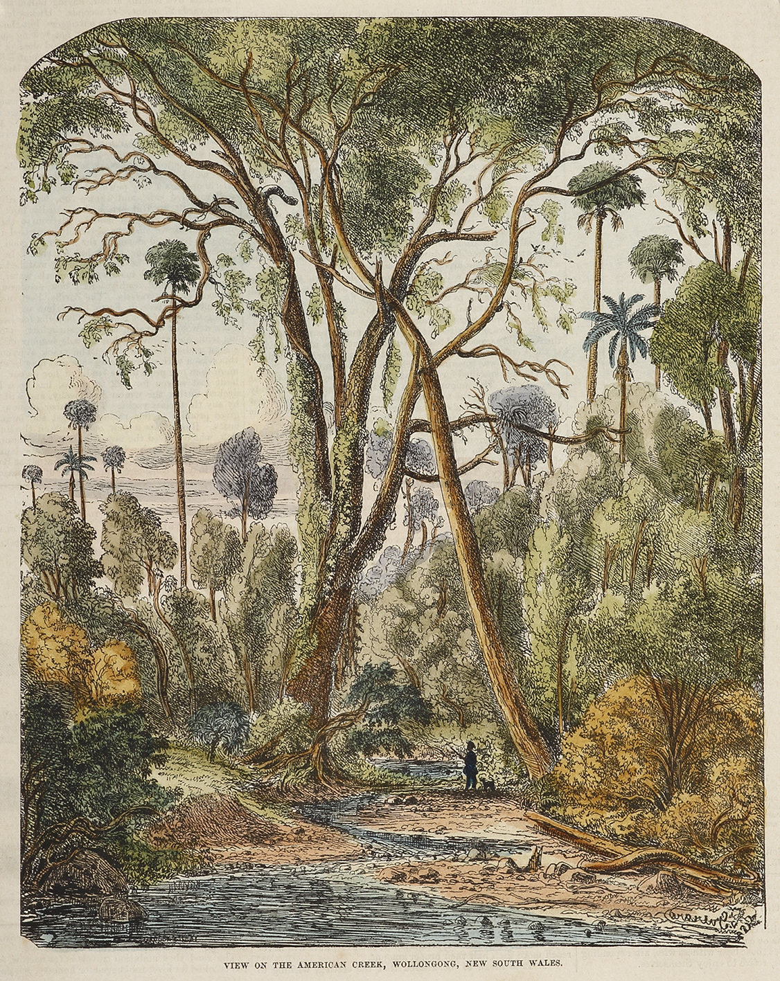 Wonderful lithograph recording the luxurious rain forest at American Creek, near Wollongong. The trees depicted in the lithograph include; cabbage trees (Cordyline), bangalow palms (Archontophoenix cunninghamiana) and flame trees (Brachychiton acerifolium). Woodcutters can be seen at work at lower left of the image.