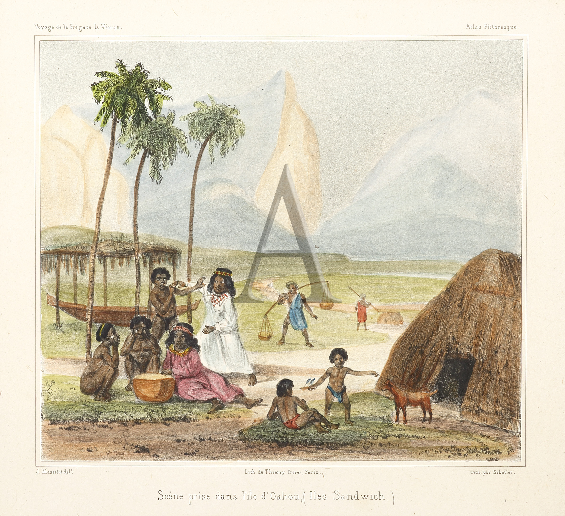 Scene of a group of villagers at Honolulu, Oahu Island. The Venus had anchored off Honolulu on 8 July 1837, having sailed from Calao to check on the existence of the island of St Paul, shown on some old charts … Read Full Description