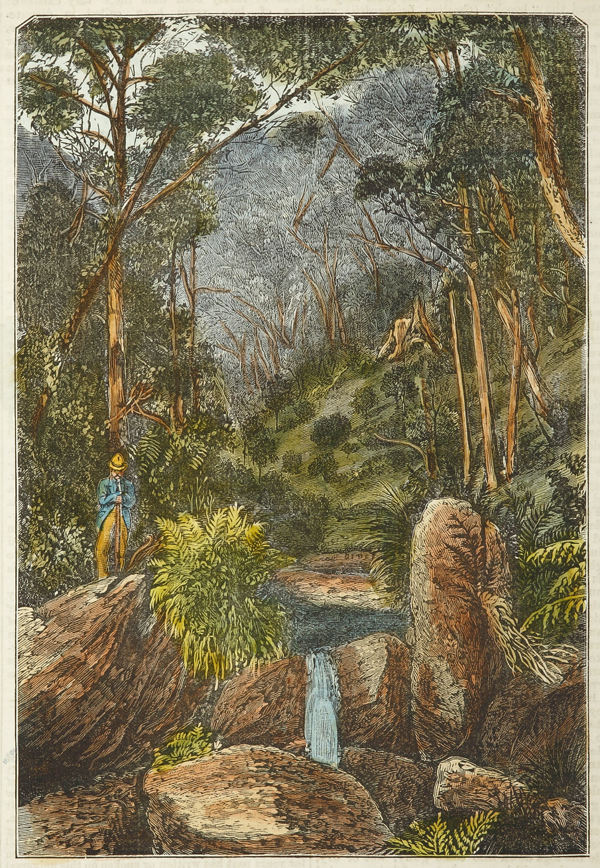 Very rare engraving of Joadja Creek, New South Wales. Joadja Creek was a thriving mining town between 1870–1911. The town existed to mine oil shale from which kerosene was extracted by the Australian Kerosene Oil and Mineral Co. It was home for approximately 1,200 people, many of whom were skilled immigrants from Scotland. After managing for ten years using bullock teams for transport, a railway was allowed and was connected to the nearby town of Mittagong by a narrow gauge railway that terminated adjacent to the main Southern Railway line in Mittagong.