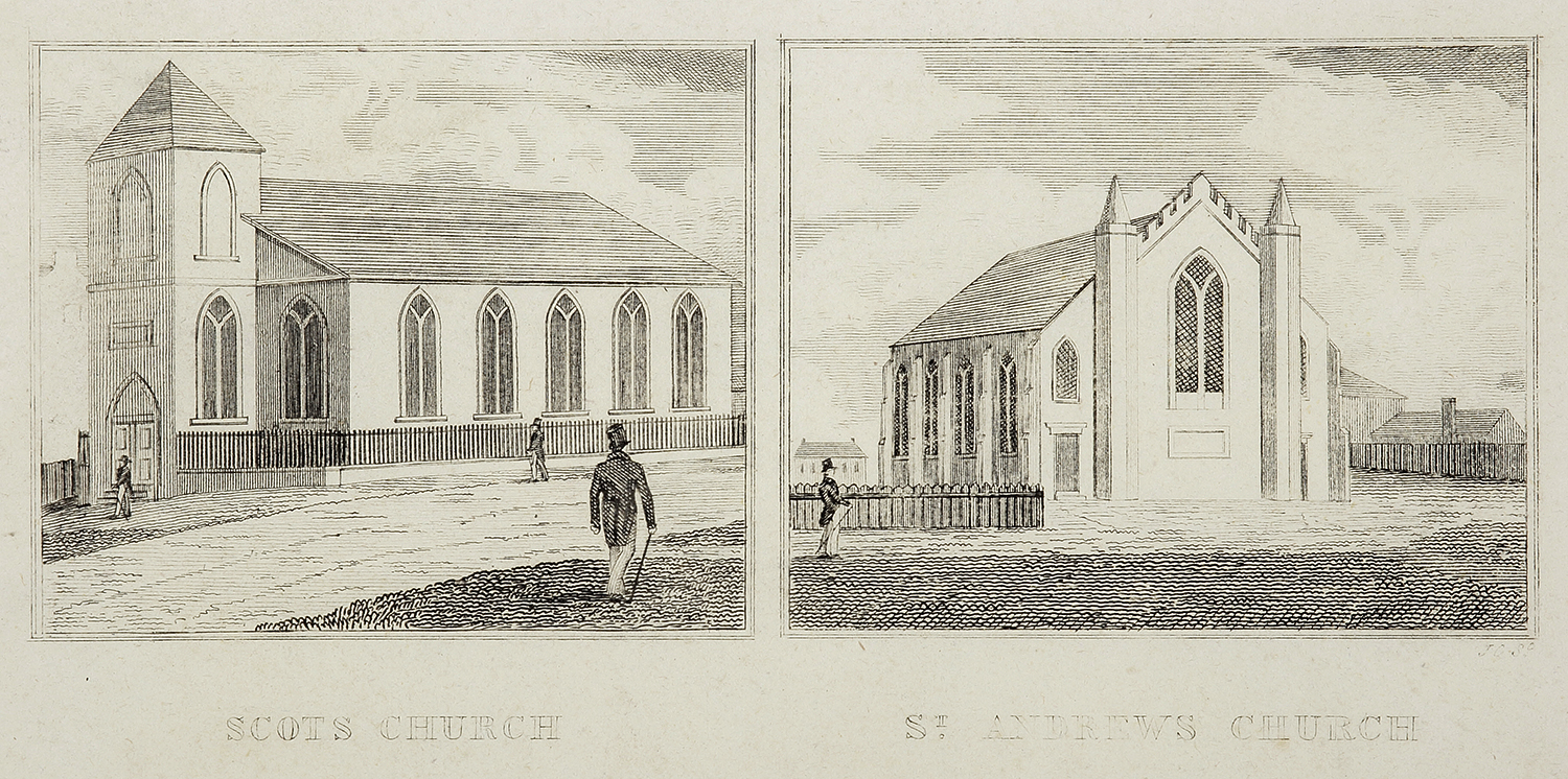 Very rare early etching of the original Scots church and St. Andrews Church, Sydney by John Carmichael.
