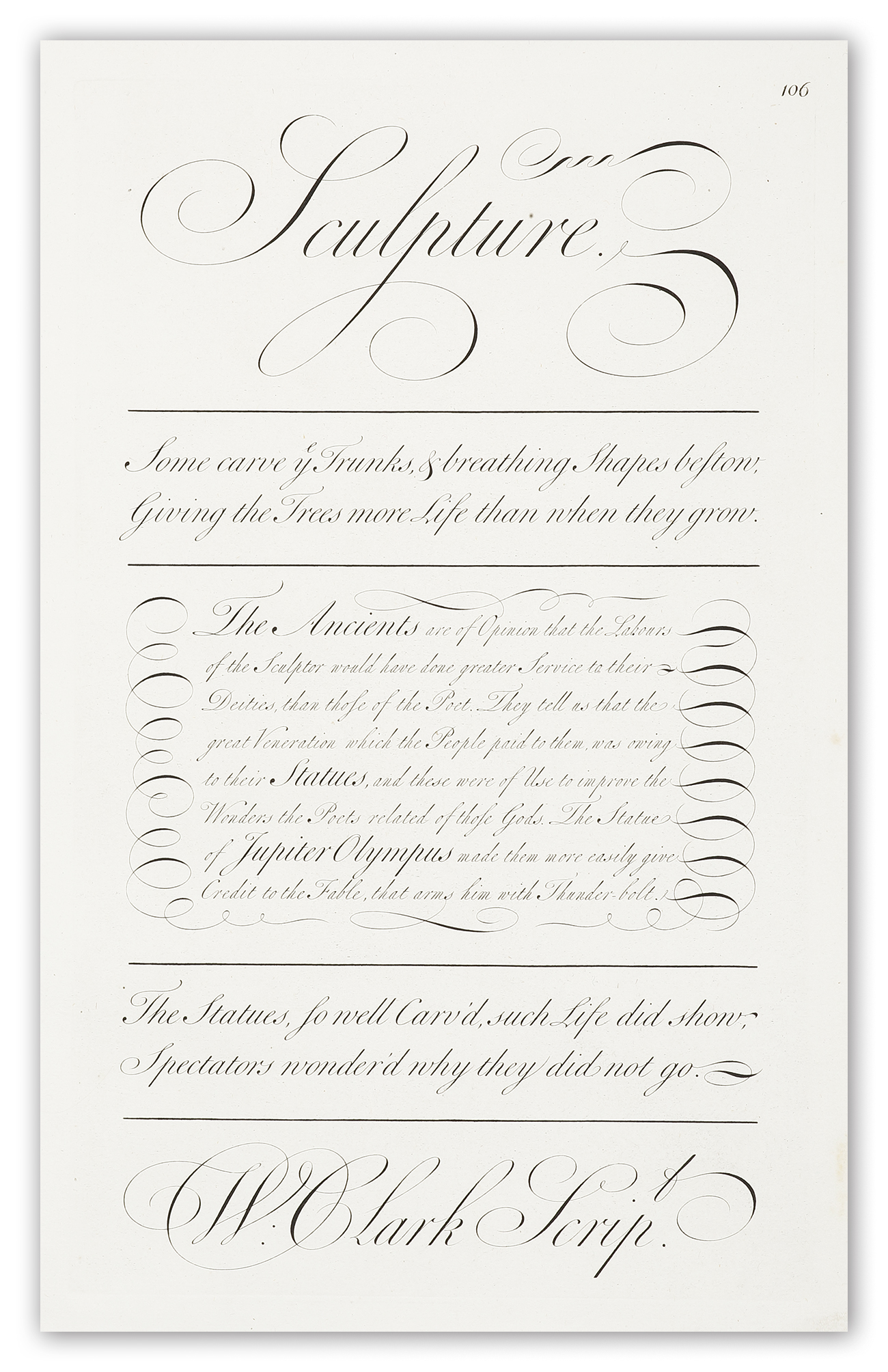 Bickham was an English writing master and engraver. He is best known for his engraving work in The Universal Penman, a collection of writing exemplars which helped to popularise the English Round Hand script in the 18th century. In 1712, Bickham wrote copy books and business texts, as there was a strong link between writing and mathematics instruction (arithmetic and bookkeeping) in the-mid 17th century to early 18th century. Bickham the Elder collected from twenty-five London writing masters in 1733 to create and engrave the penmanship samples forming the Universal Penman, which was reported to be the most important and popular of copy texts used by writing masters to instruct their pupils. Appearing in Bickham’s Universal Penman was this poem by writing master Samuel Vaux, dated 1734, conveying, that poor writing was a disgrace to the beauty of the writer: “An artless Scrawl ye blushing Scribler shames; All shou’d be fair that Beauteous Woman frames.” And then this piece, hinting, that calligraphy may have a role in encouraging romance: “Strive to excel, with Ease the Pen will move; And pretty line add Charms to infant Love.” (Monaghan, 2005, p. 281). George Bickham also published The British Monarchy, which is a collection of 188 plates of historical notes with 43 plates of views of English and Welsh counties. They are called views, rather than maps, though they are presented as map-like perspectives with major towns marked. His son George Bickham the Younger also followed in the family tradition of engraving.