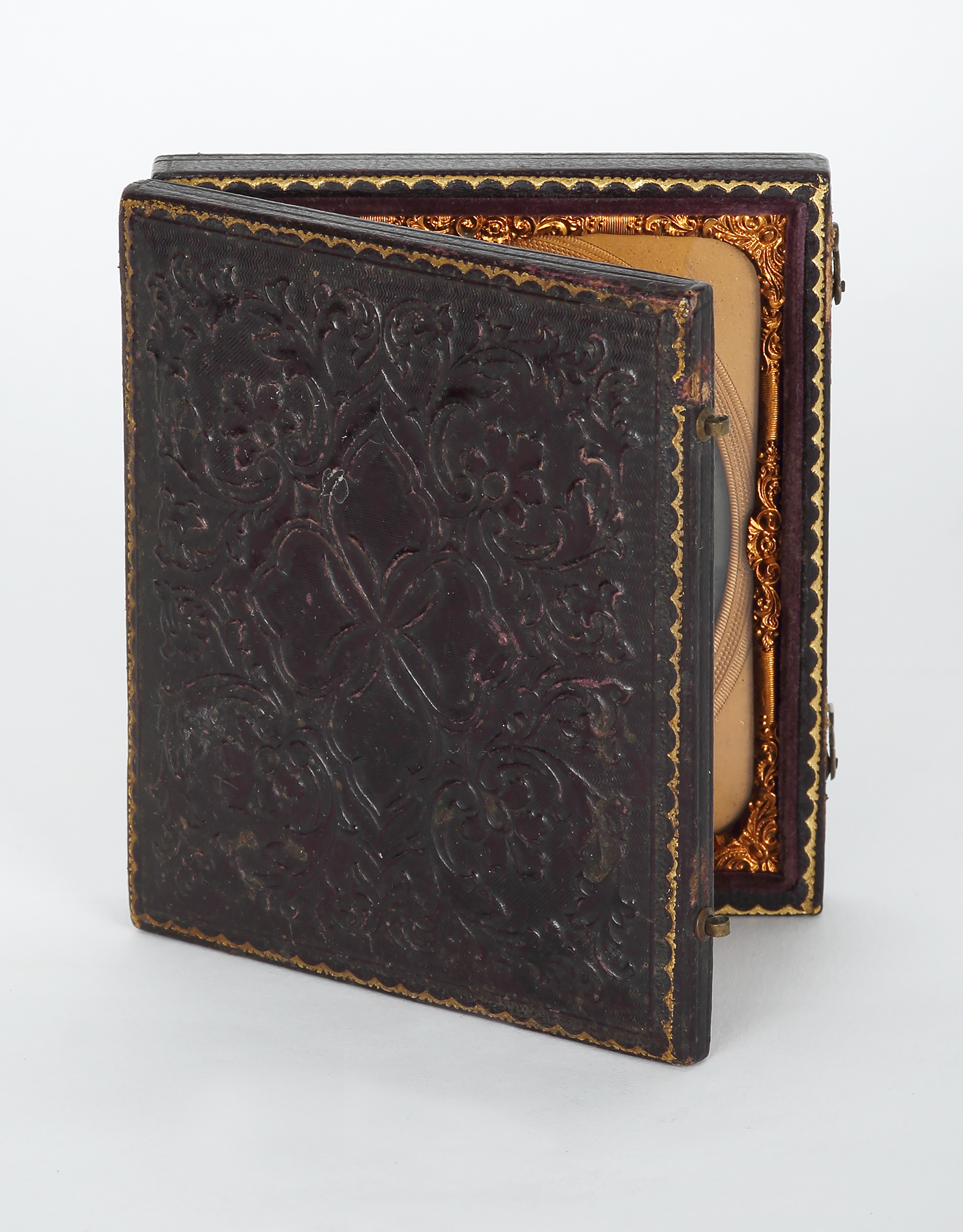 James Ambrose Cutting patented the ambrotype process in 1854. Ambrotypes were most popular in the mid-1850s to mid-1860s. Cartes de visite and other paper print photographs, easily available in multiple copies, replaced them. An ambrotype is comprised of an underexposed glass negative placed against a dark background. The dark backing material creates a positive image. Photographers often applied pigments to the surface of the plate to add color, often tinting cheeks and lips red and adding gold highlights to jewelry, buttons, and belt buckles. Ambrotypes were sold in either cases or ornate frames to provide an attractive product and also to protect the negative with a cover glass and brass mat.