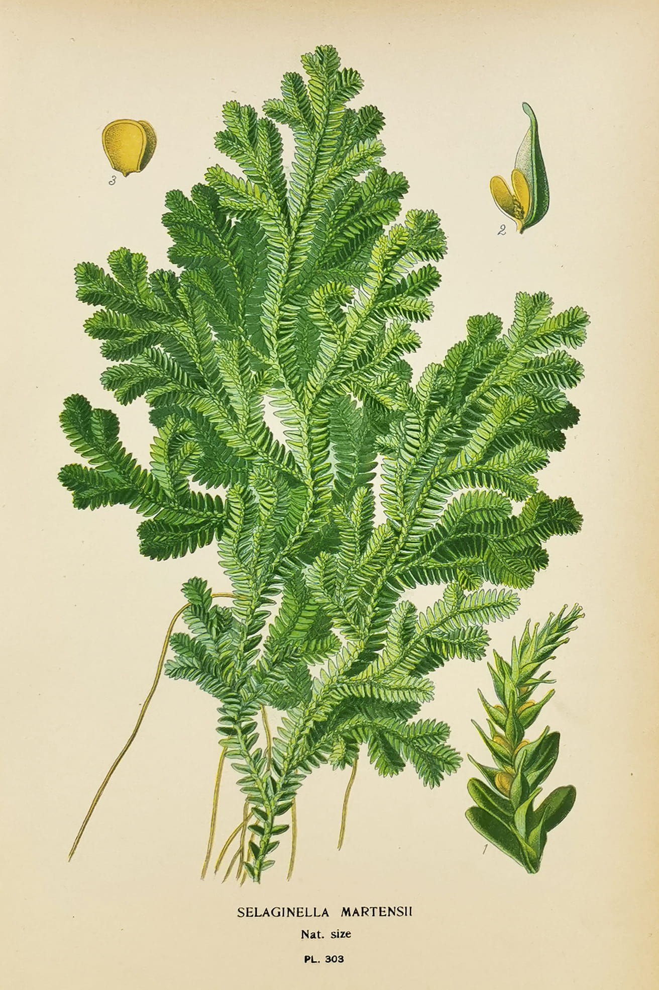 Engraving of the Selaginella martensii, the variegated spikemoss or Martens’s spike moss, a lycophyte in the Selaginellaceae family. It is native to Mexico and Central America.