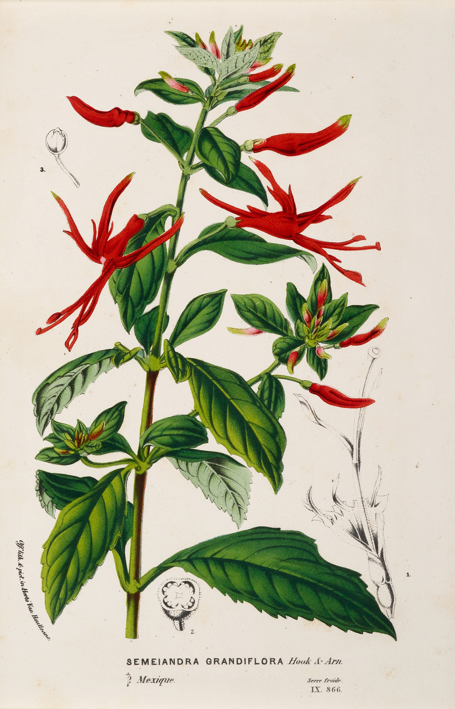 Stunning botanical illustration of Lopezia grandiflora. From Louis van Houtte’s, Flore des Serres et des Jardins de l’Europe References: Nissen, C. Die Botanische Buchillustration. Stuttgart 1966 2254. Sitwell, S. Fine Flower Books 1700-1900. New York 1990 p. 84. Plesch, A. The … Read Full Description