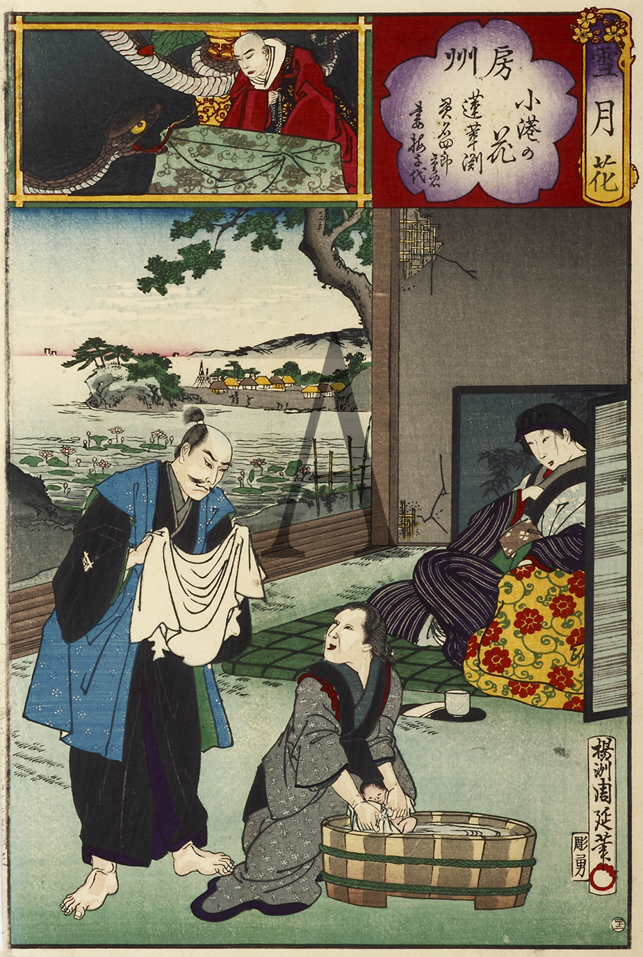 A baby receives his first bath, with his fisherman father Myomeijiro holding a towel, his grandmother at the wooden tub and his mother Umechiyo sitting with a cup of tea. The child would become the Buddhist prelate Nichiren (1222-1282), whose miraculous birth was accompanied by the sun rising over a lotus pond at Kominato. Nichiren became a strong proponent of the Rengekyo (Lotus Sutra). Inset The Buddhist priest Nichiren reading the Lotus Sutra, undistracted by a serpent. From the series Setsugekka. ‘Snow, Moon, Flowers’