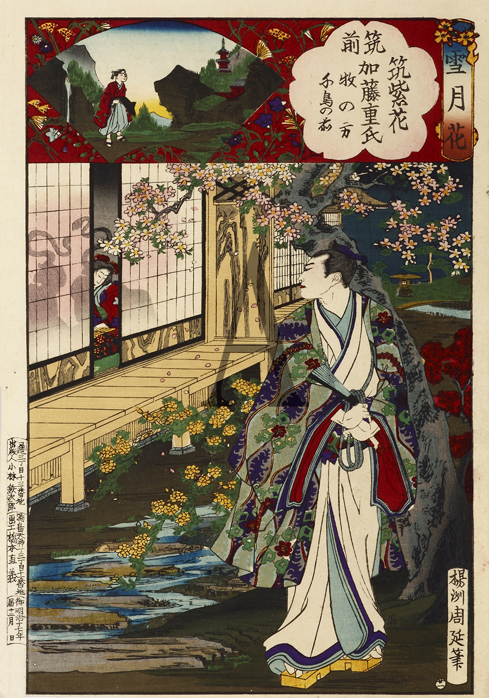 In the Noh play Kato Shigeuji, the military governor of Chikuzen Province in northern Kyushu, becomes disillusioned with the sensual world and seeks spiritual refuge on Mt. Koya, a temple centre on the main island of Japan, Honshu. Although he abandoned his family while his son was still a baby. The son is shown here as a young man dutifully going in search for Shigeuji but ultimately turned away. Inset Ishidomaru approaching the temples of Mount Koya. From the series Setsugekka. ‘Snow, Moon, Flowersowers’