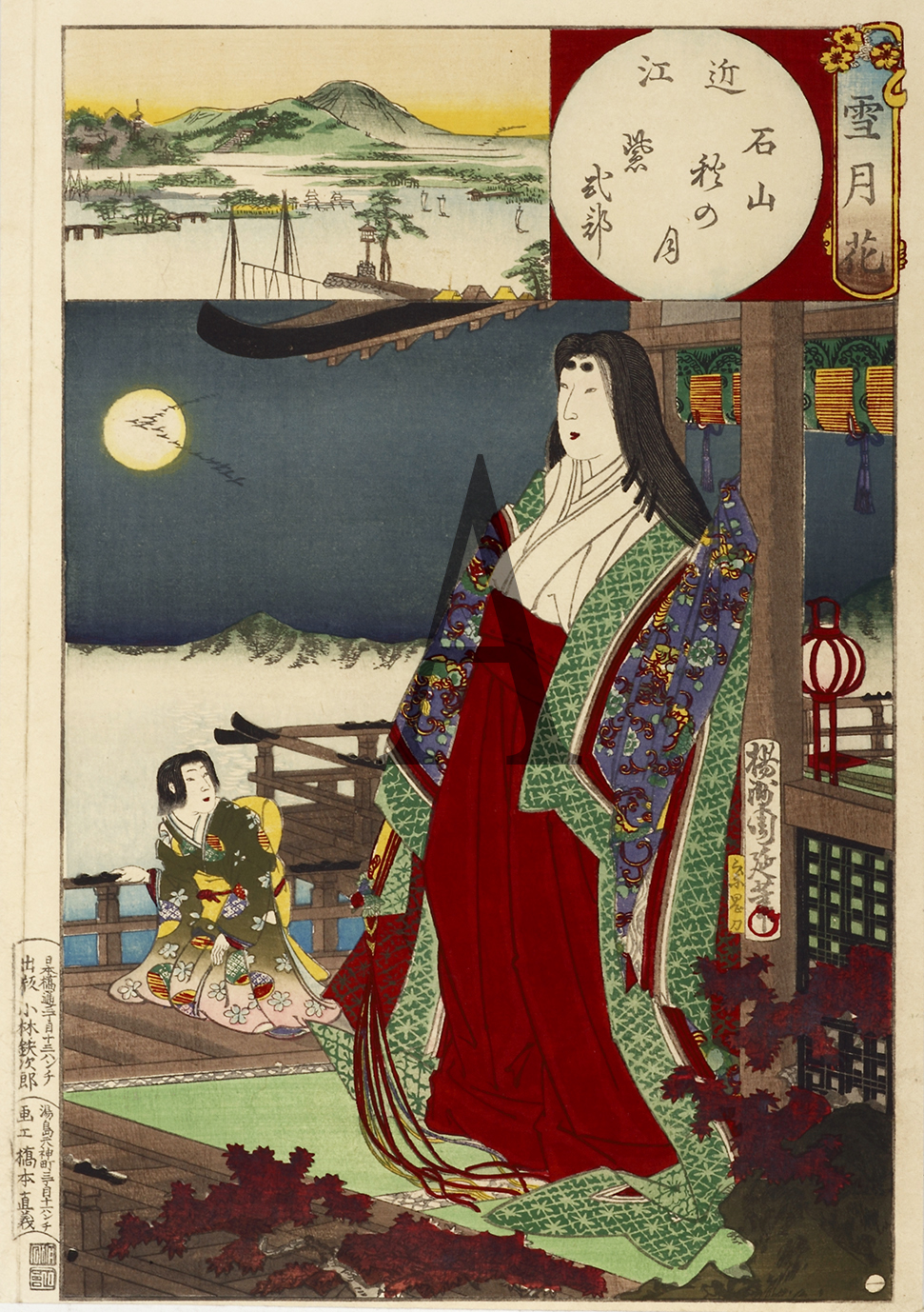 Lady Murasaki Shikibu, author of the C11th novel, ‘The Tale of the Genji’, stands on the veranda of the Buddhist temple at Ishiyama, where she reportedly began writing one of the 54 chapters of her book which documents the lives of three generations of imperial courtiers. Inset View over Lake Biwa toward the temple pagoda at Ishiyama and Mount Hiei beyond. From the series Setsugekka. ‘Snow, Moon, Flowers’