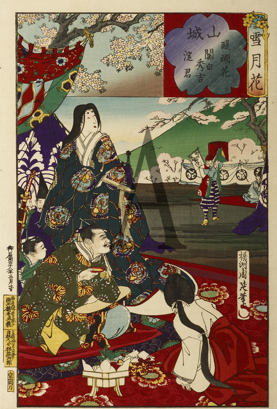 The military dictator Toyotomi Hideyoshi (1536-1598) who is regarded as Japan’s second ‘great unifier’, particularly enjoyed viewing cherry blossoms at the Buddhist temple of Daigo-ji, south of Kyoto. Here he appears with his attendants and his concubine Yodogimi, entertaining other samurai, such as those of the Tokugawa family. Hideyoshi is noted for a number of cultural legacies, including the restriction that only members of the samurai class could bear arms and promoted the tea ceremony that became an integral part of Japanese tradition and created demand for fine porcelain amongst the ruling class. In 1583, Hideyoshi began construction of Osaka Castle. Inset: Cherry blossoms. From the series Setsugekka. ‘Snow, Moon, Flowers’.