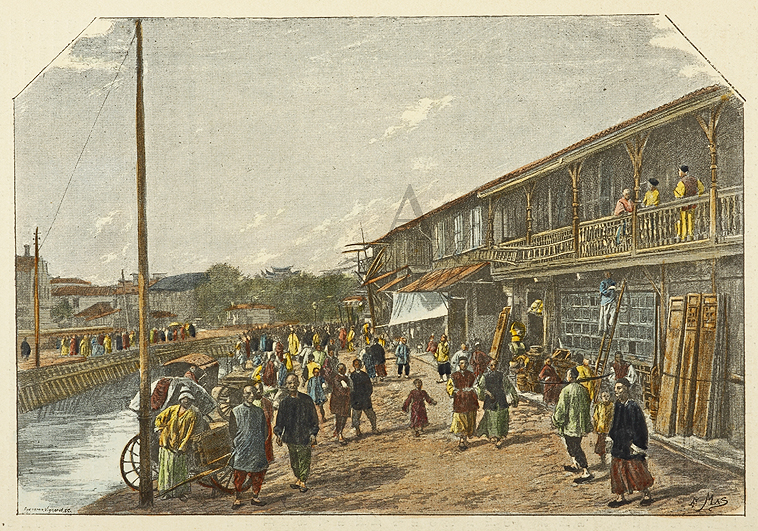 Scarce c.19th French hand coloured engraving of Shanghai.