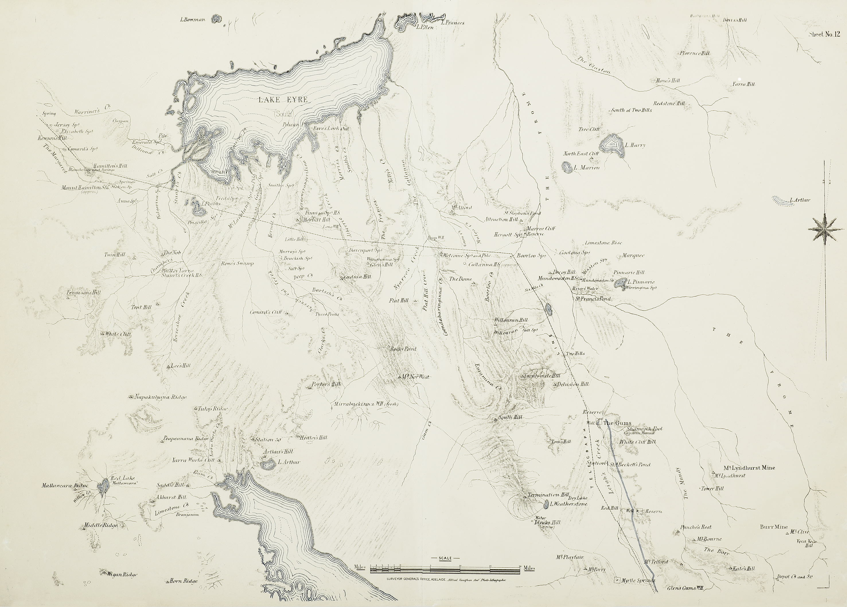 Rare and important detailed map of part of South Australia by George Goyder (1826-1898) of northern South Australia covering the country south of Lake Eyre South with following detailed information: