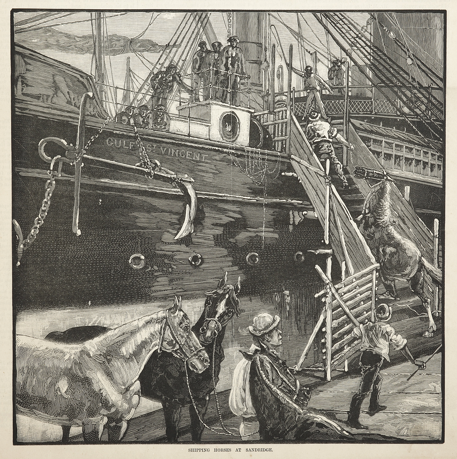 Colonial engraving of horses bound for India being loaded onto the Gulf of St. Vincent at Port Melbourne. From the original edition of the Australasian Sketcher.