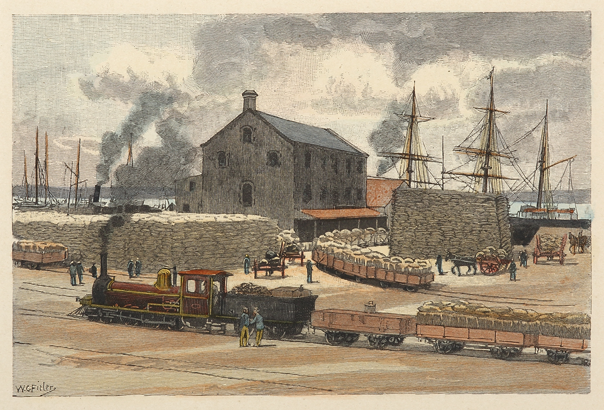 Colonial engraving of wheat being loaded from a train onto ships at Port Pirie. The town was named by Governor Robe after the schooner the John Pirie, which was the smallest of the ships in the First Fleet of South Australia that carried colonists and supplies to the Colony of South Australia in 1836.