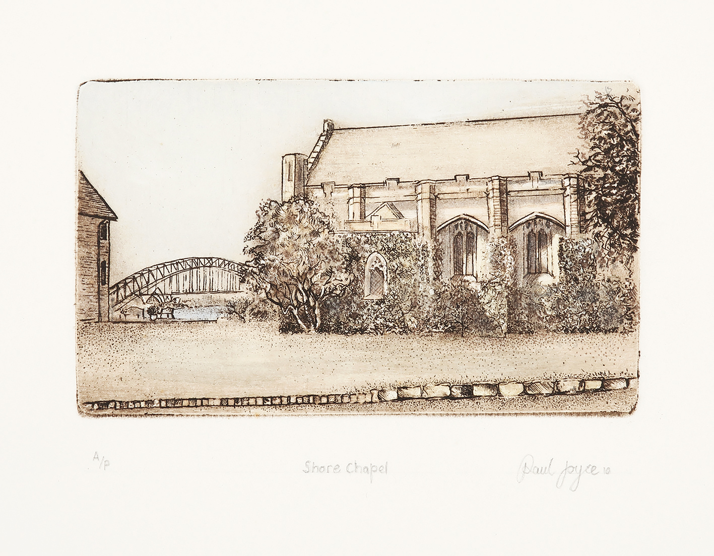Delicate hand coloured etching printed featuring the Shore Chapel, with the Sydney Harbour Bridge in the background.