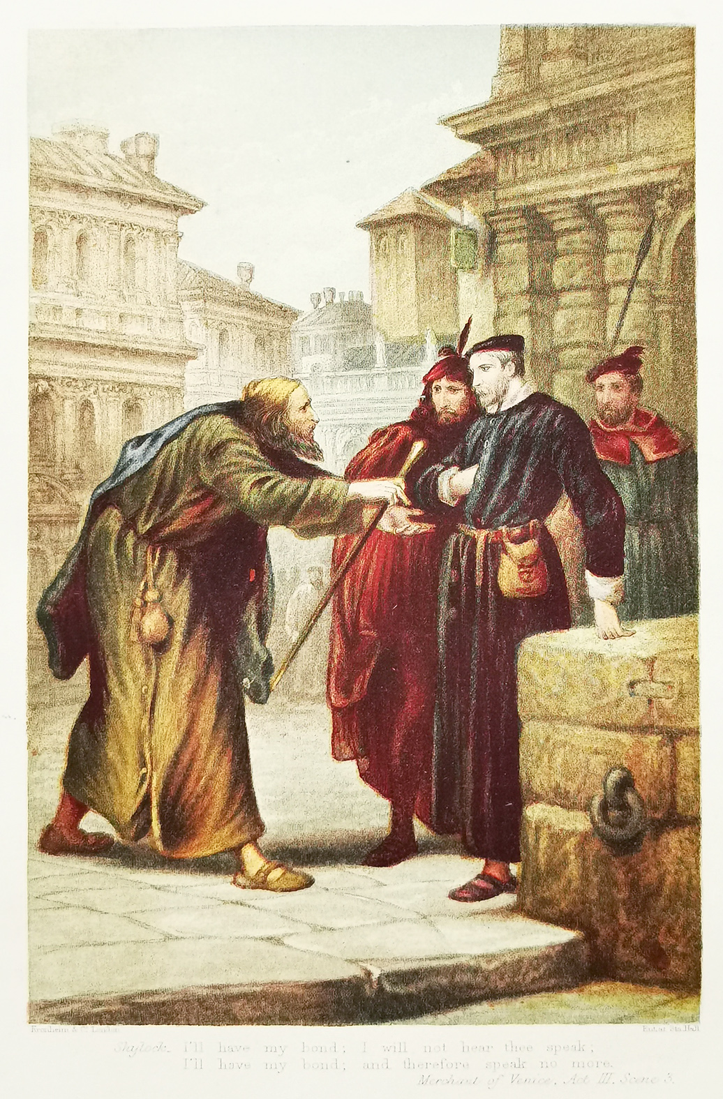 Engraving from The Complete Works of Shakespeare. Shylock – I’ll have my bond; I will not hear thee speak;I’ll have my bond; and therefore speak no more. Merchant of Venice, Act III, Scene 3.