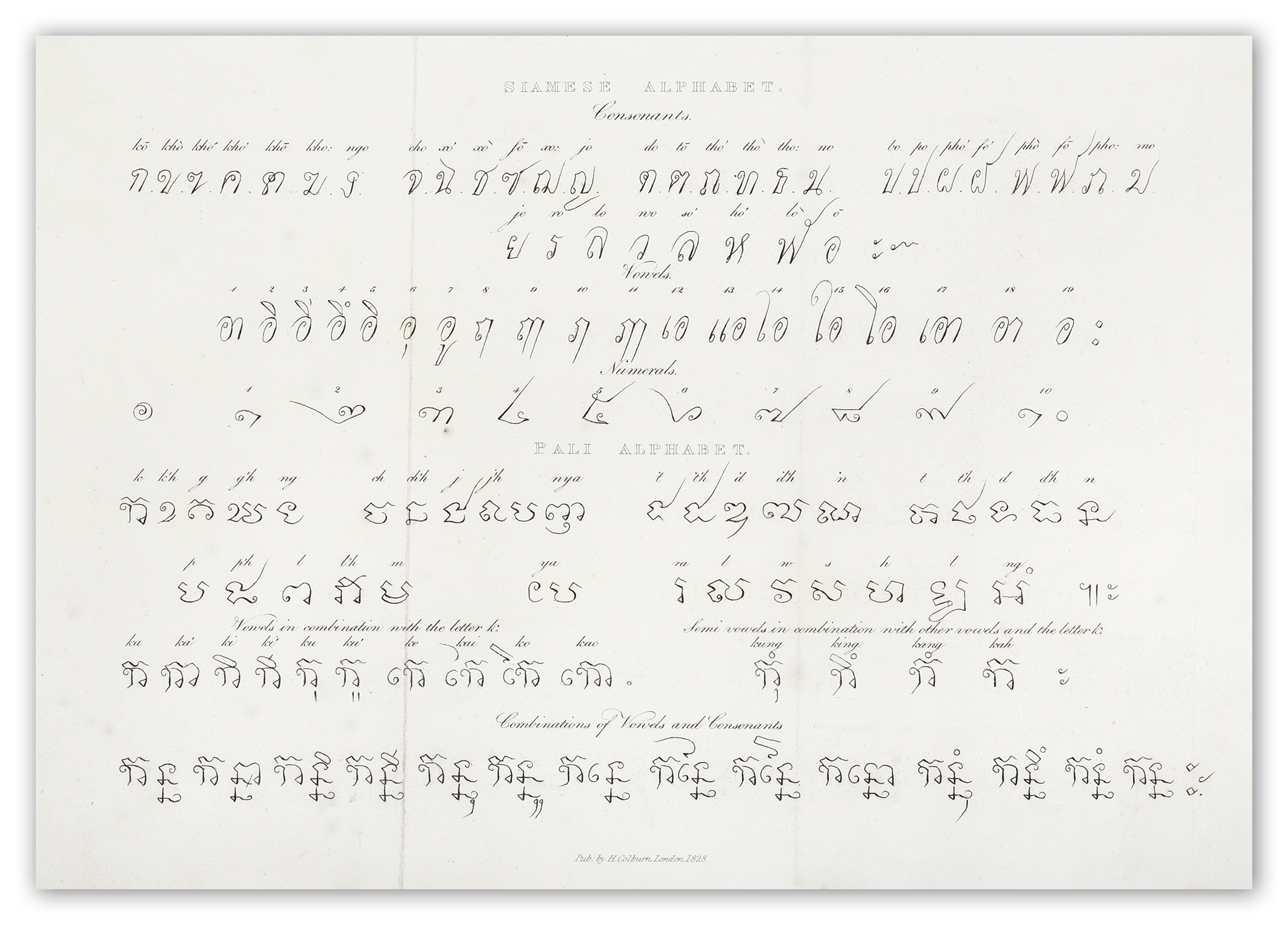Early engraving of the Thai alphabet by Crawfurd a Scottish physician and orientalist who made a diplomatic mission to Siam (Thailand) and Cochin China prior to to the British formally seeking to enter into treaties with these countries. As a linguist he provide a unique understanding and observations of the of the culture prior to the opening of trade with the west.