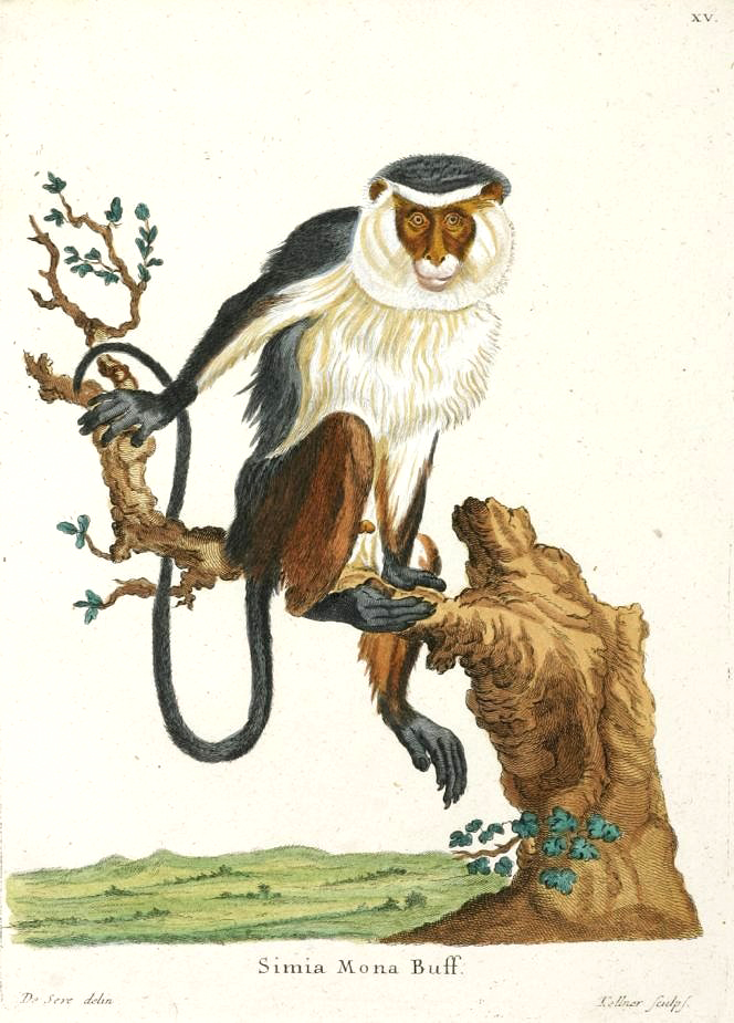 MONA MONKEY MODERN SCIENTIFIC NAME: Cercopithecus mona DISTRIBUTION: Found in Nigeria, Ghana, Cameroon, Senegal, Congo, Angola, Kasai, Gambia, Kwango, and West Uganda. Introduced to Grenada around the late 1600s.