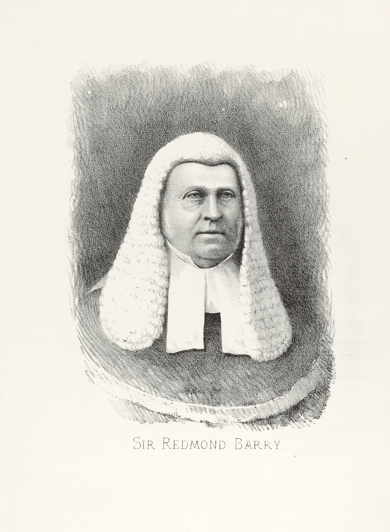 Lithograph portrait of Sir Redmond Barry (1813-1880). Barry was a colonial judge in Victoria, and the inaugural Chancellor of the University of Melbourne, serving from 1853 until his death in 1880. He famous for having sentenced Ned Kelly to death.