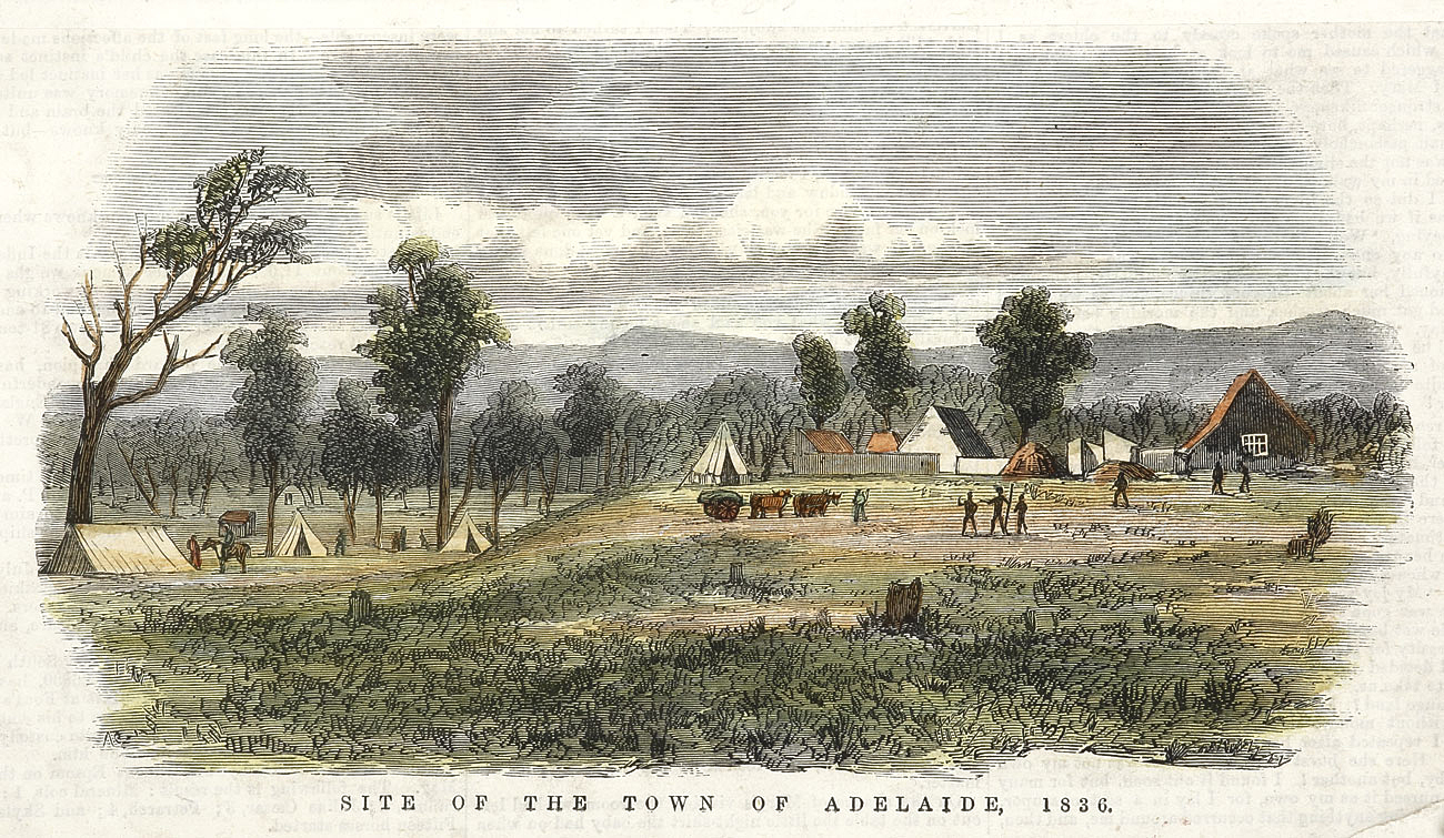 Colonial engraving of the first settlement of Adelaide showing Colonel William Light’s encampment. From the original edition of the Illustrated Australian News.