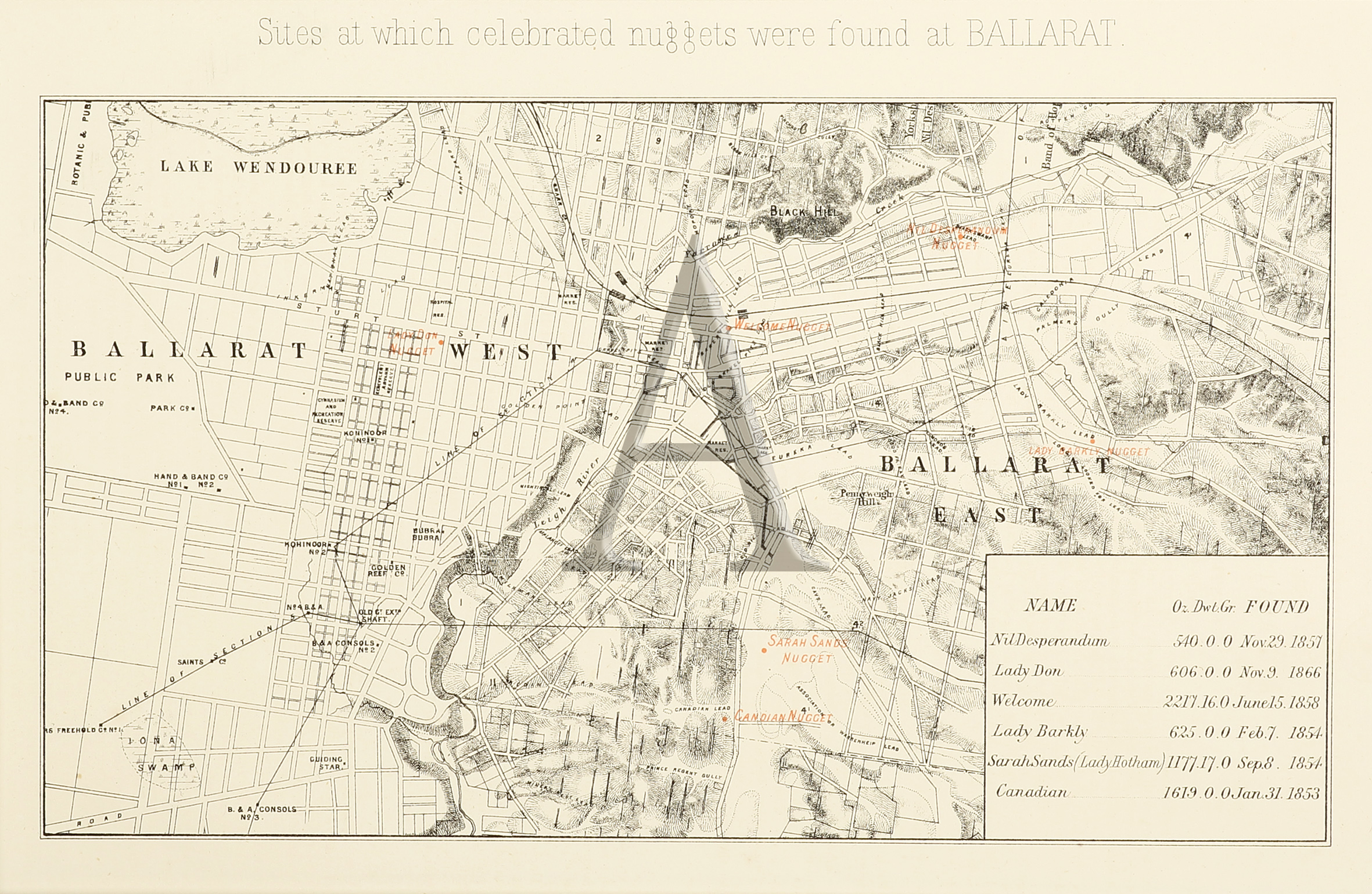 Rare map showing the locations of all the famous large nuggets found in Ballarat in the 1850’s.