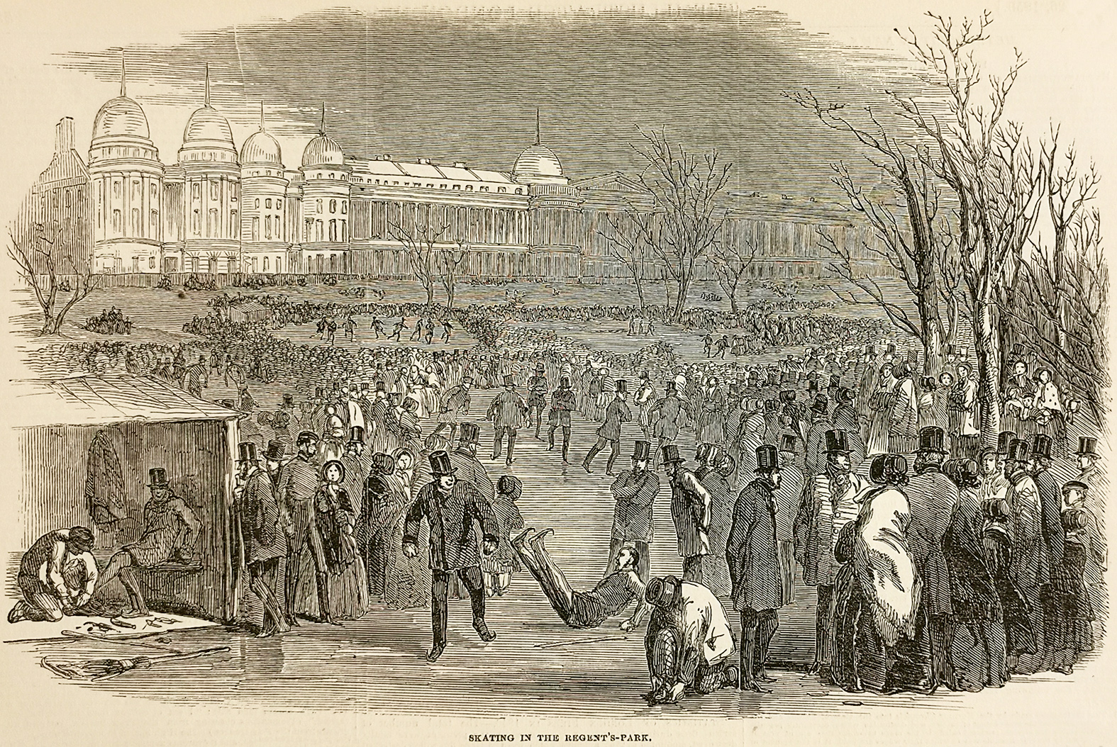 Engraving of skaters at Regent Park, London From the original edition of The Illustrated London News.
