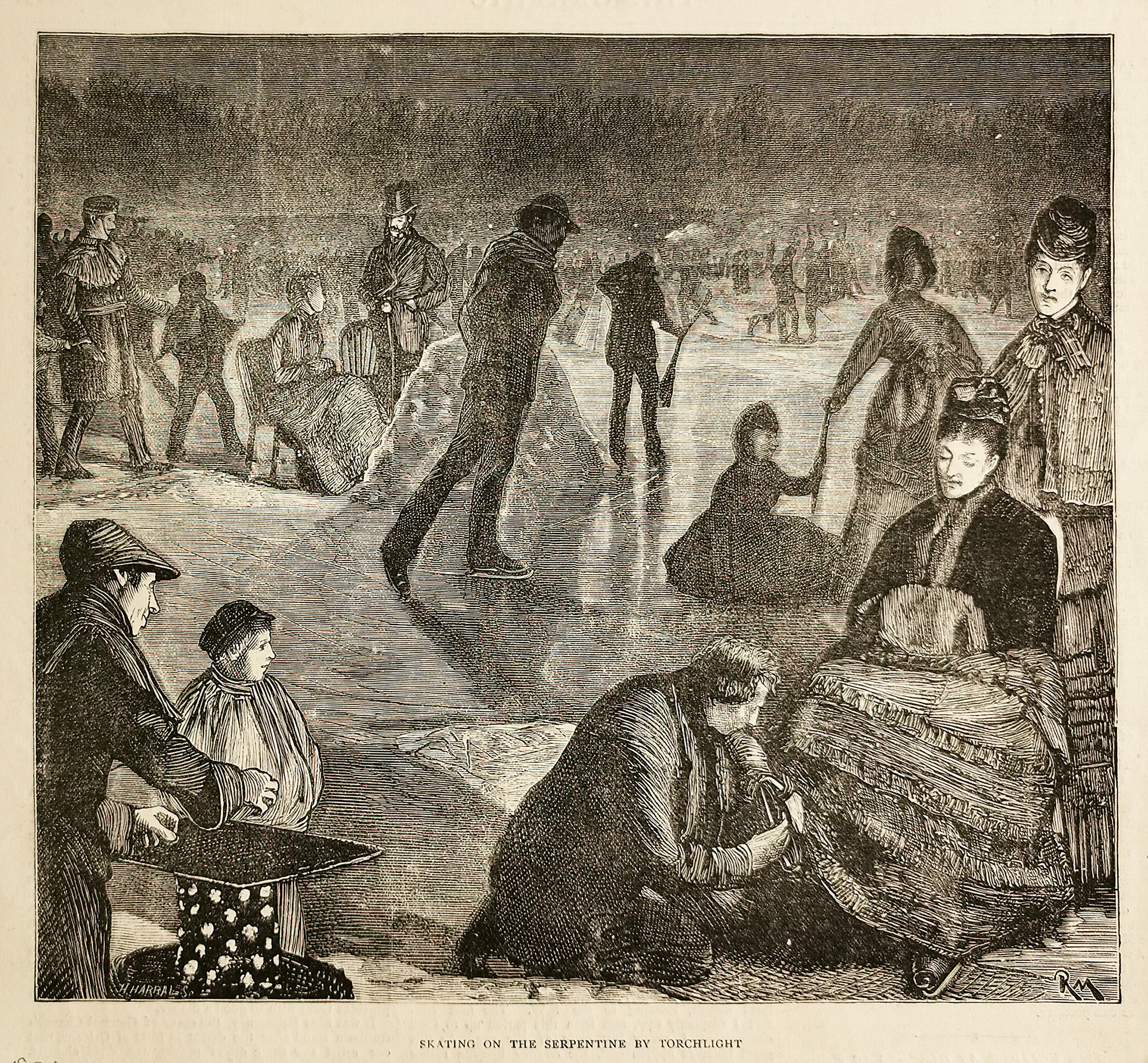 Skating at night on the Serpentine, London. From the original edition of The Graphic.