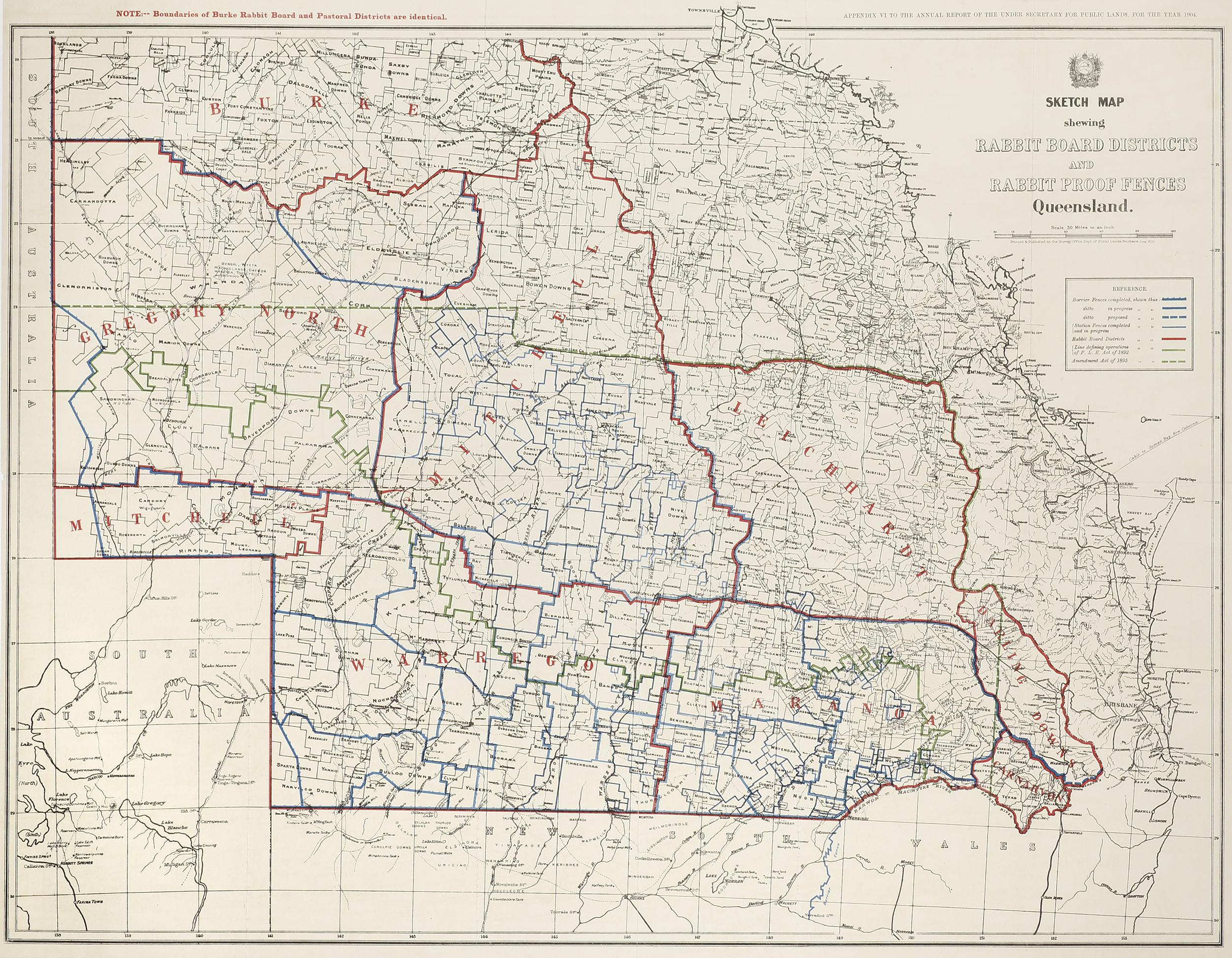 Rare map showing the extent of existing and proposed rabbit proof fencing in Queensland to 1904, made as a result of the Royal Commission held to investigate the problem in 1901.
