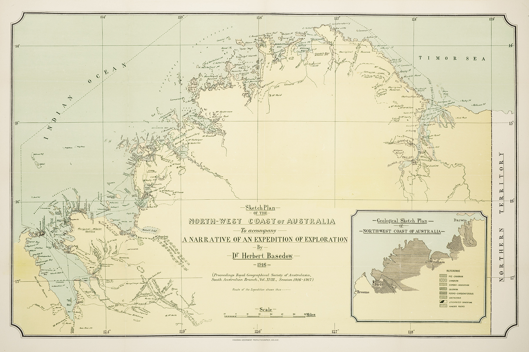 The map shows the route of Herbert Basedow’s the expedition of and exploration of north west Western Australia in 1916. As leader in a search for munition minerals in the northern Kimberley area, he found time to gather valuable ethnological data on this area.