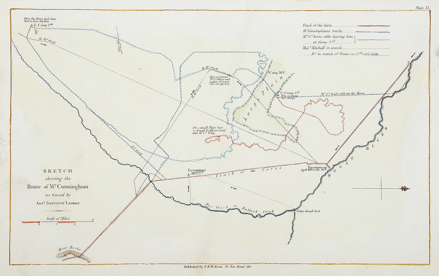 Rare c.19th map showing the route of Mr. Cunningham as traced by Assistant Surveyor Larmer.