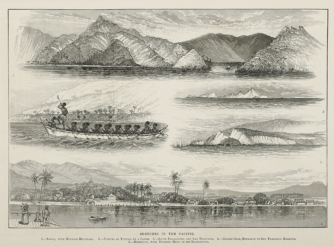 Scarce c.19th engraving of Pacific islands with the lower large image being of Diamond Head, Honolulu, Hawaii. Titles of views: 1. Samoa, with Matafoo Mountain 2. Natives of Tutuila in a Canoe 3. South Farallones, off San Francisco 4. Golden … Read Full Description