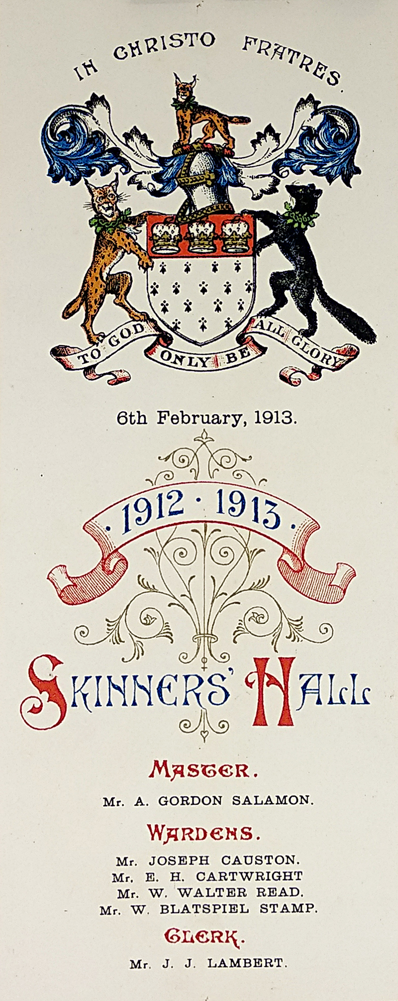 English menu for the 1913 the Company of Skinners dinner.