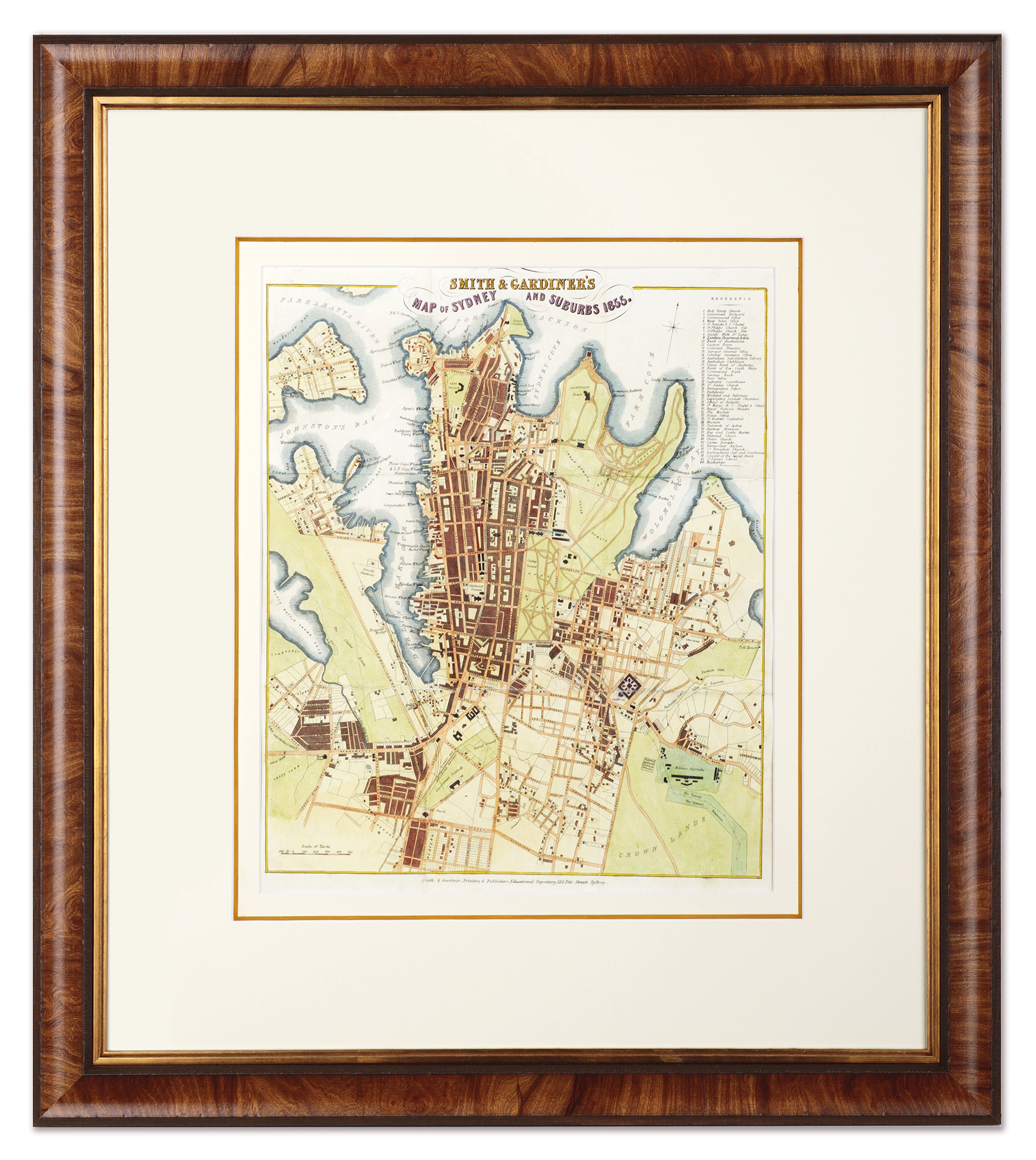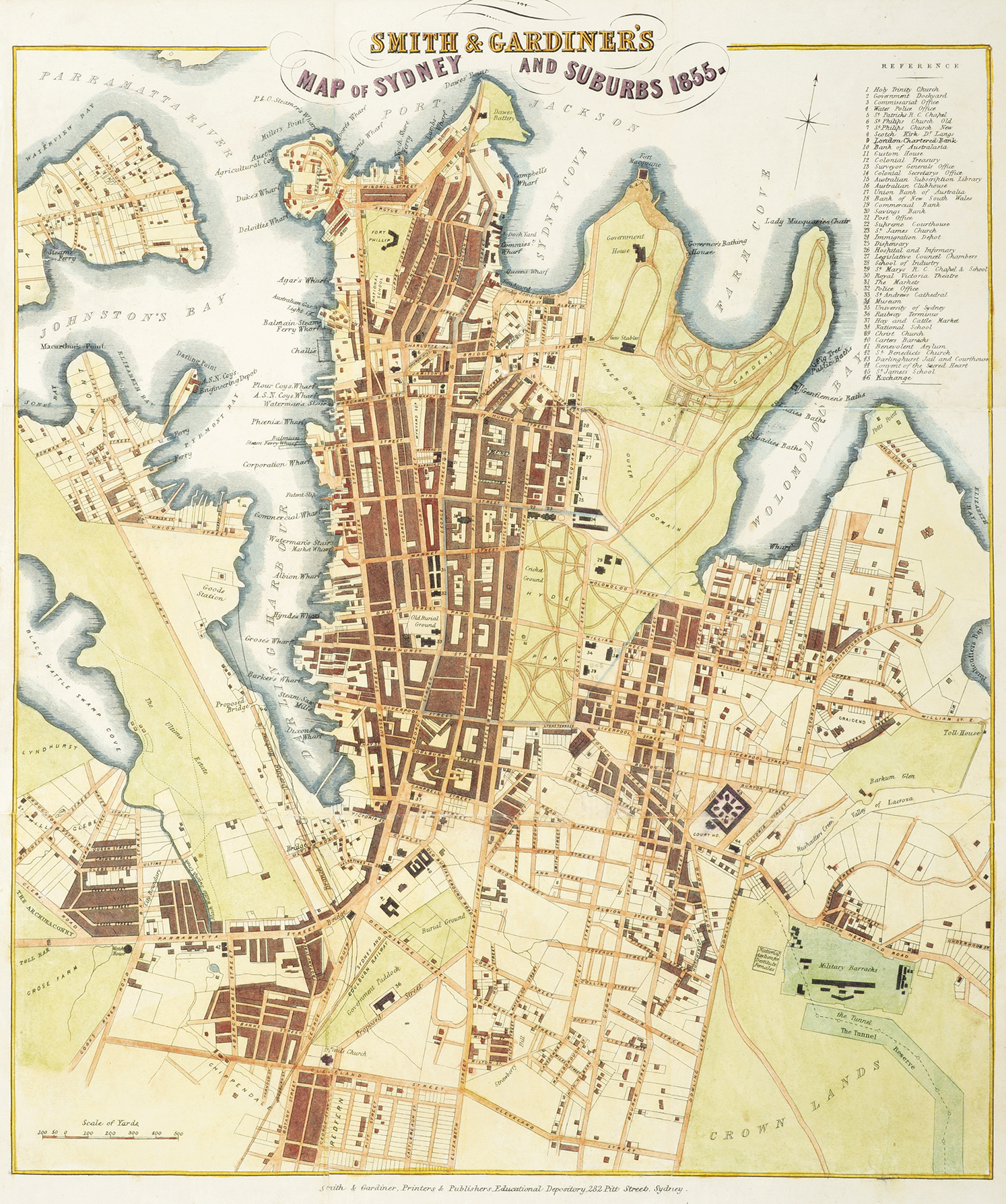 Rare early, detailed plan of Sydney extending from ‘Black Wattle Swamp Cove’ (present day Prince Alfred Park) in the west to ‘Toll House’ (near present day Ruschcutters Bay) in the east. A key at top right lists forty six churches, banks, government buildings, hospitals, markets, railway stops, barracks, jail, and stock exchange.