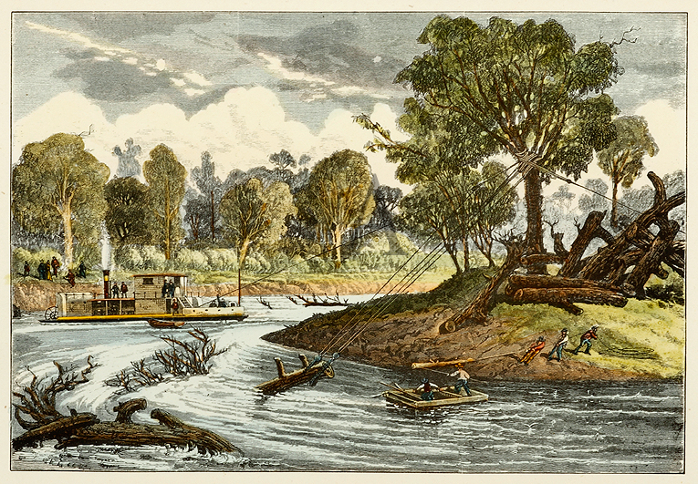 Wonderful c.19th engraved image of a paddle steamer at work removing snagged logs from swollen river. Collections: State Library Victoria: MC 919.45 N42I National Library Australia: Bib ID: 2264805 State Library New South Wales: 991021280379702626 Collections: State Library Victoria: MC … Read Full Description
