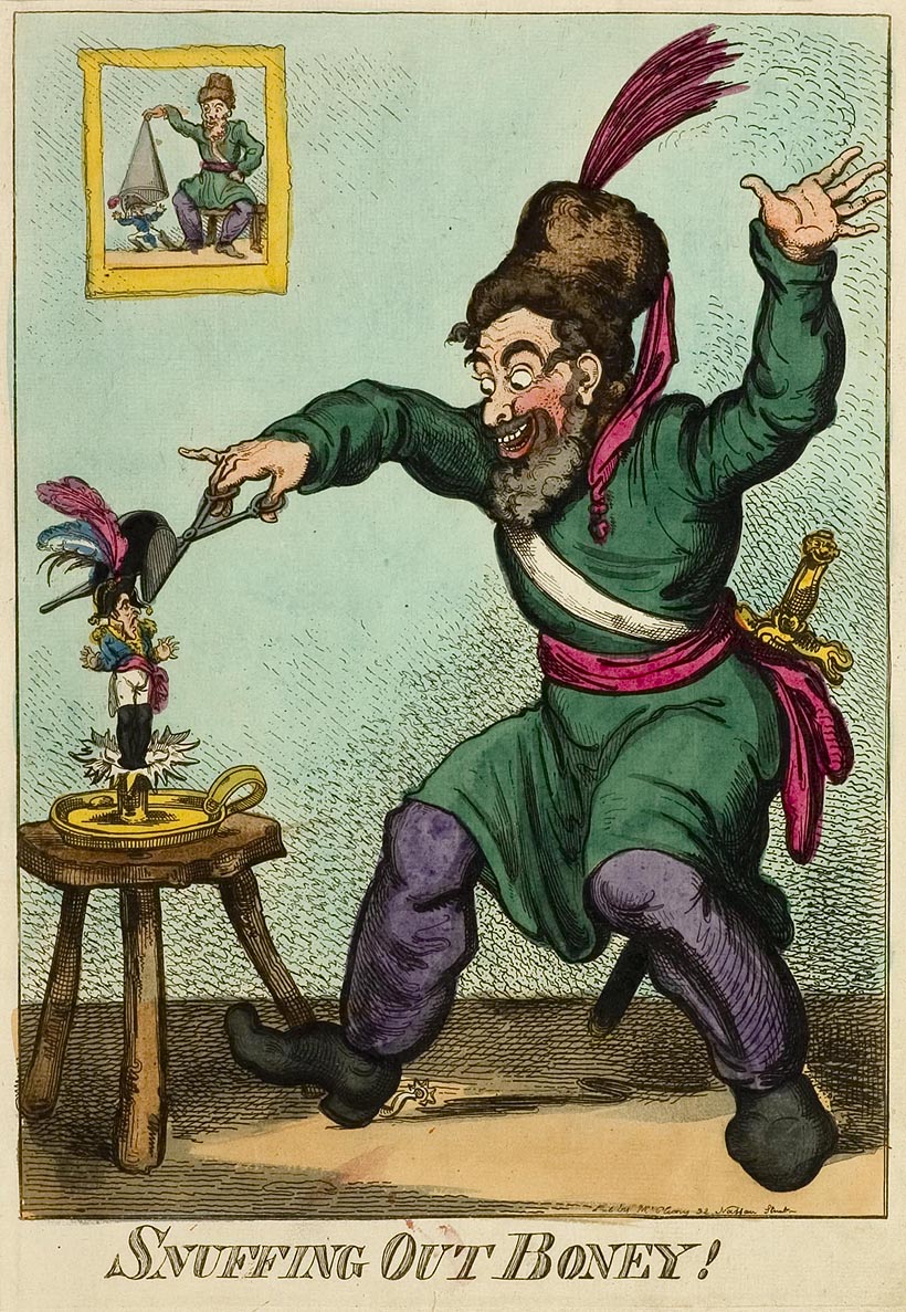 An enormous dancing Cossack uses a large pair of snuffers to grip the head of a tiny figure of a terrified Napoleon who is emerging like a candle. On the wall above Napoleon is a print of a seated Cossack about to place an extinguisher over another figure of Napoleon.