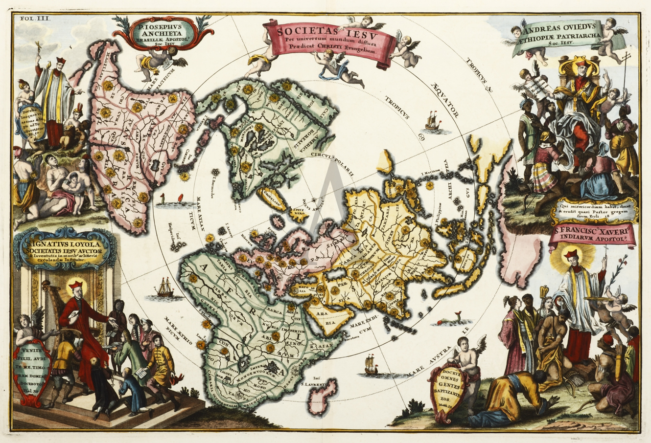 Jesuit cartographer, polar map from his Atlas Novus showing the extent of the Society of Jesus, decorated with figures of Jesuits saints in each corner with the peoples that had been converted. California is shown as an island.