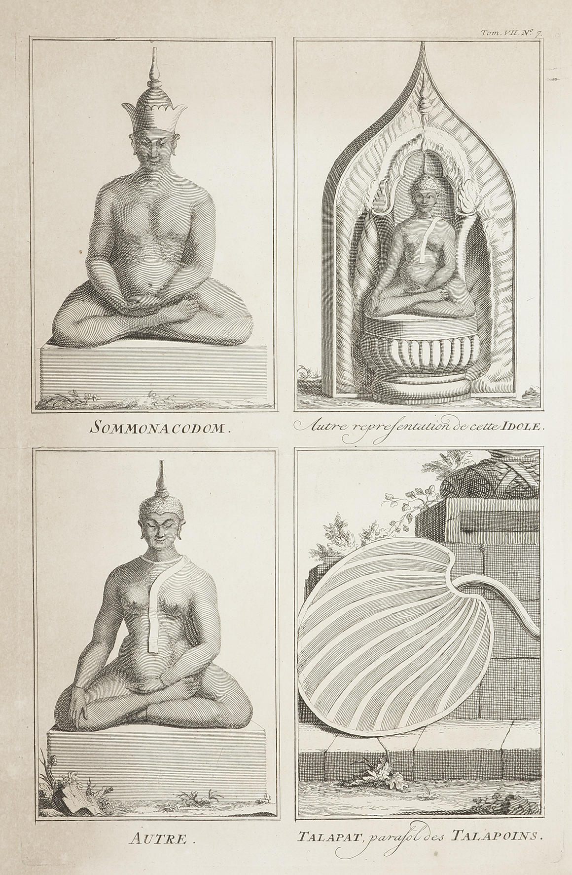 C.18th engraving of Siamese (Thai) dieties. Talapat, from Portuguese talapão; de talapat, name in Siamese, for the palm tree, the leaf of which provides the material for the fan that the monks constantly carry in their hands.