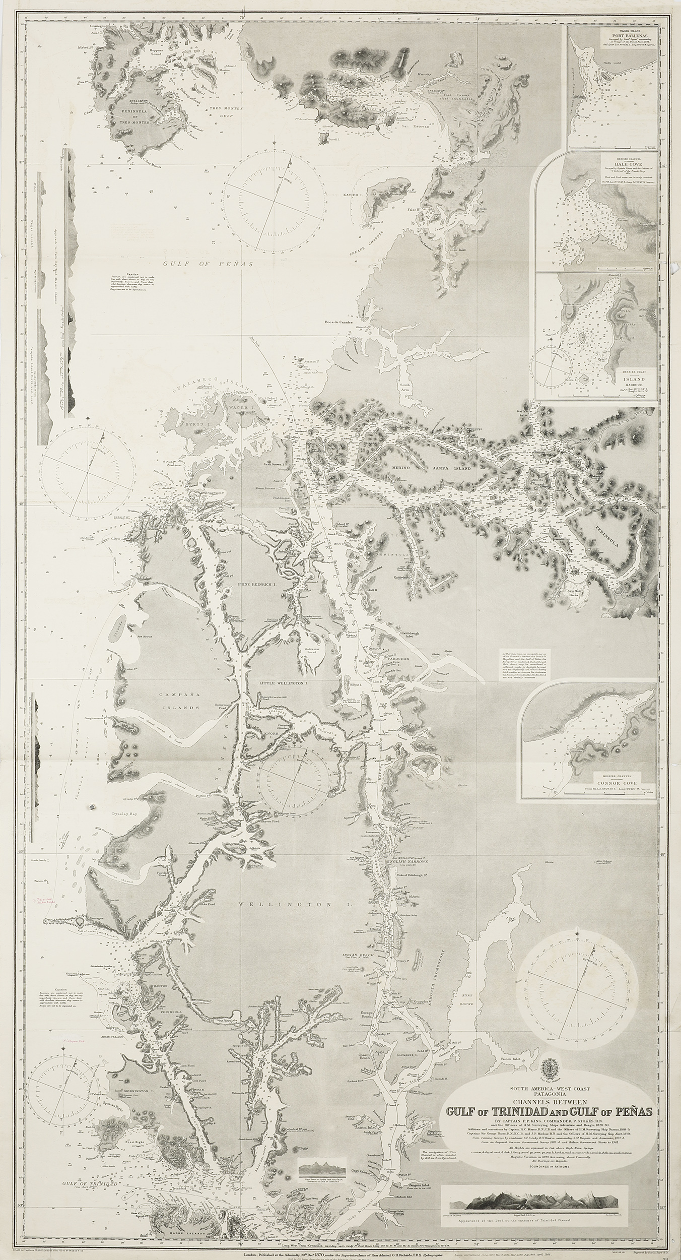 Very large Hydrographic chart of the coast of Chile, South America from the surveys by Phillip Parker King and Lort Stokes in 1828-30. First issued 20th December, 1870, with large corrections to April 1906 and small corrections to 1909.