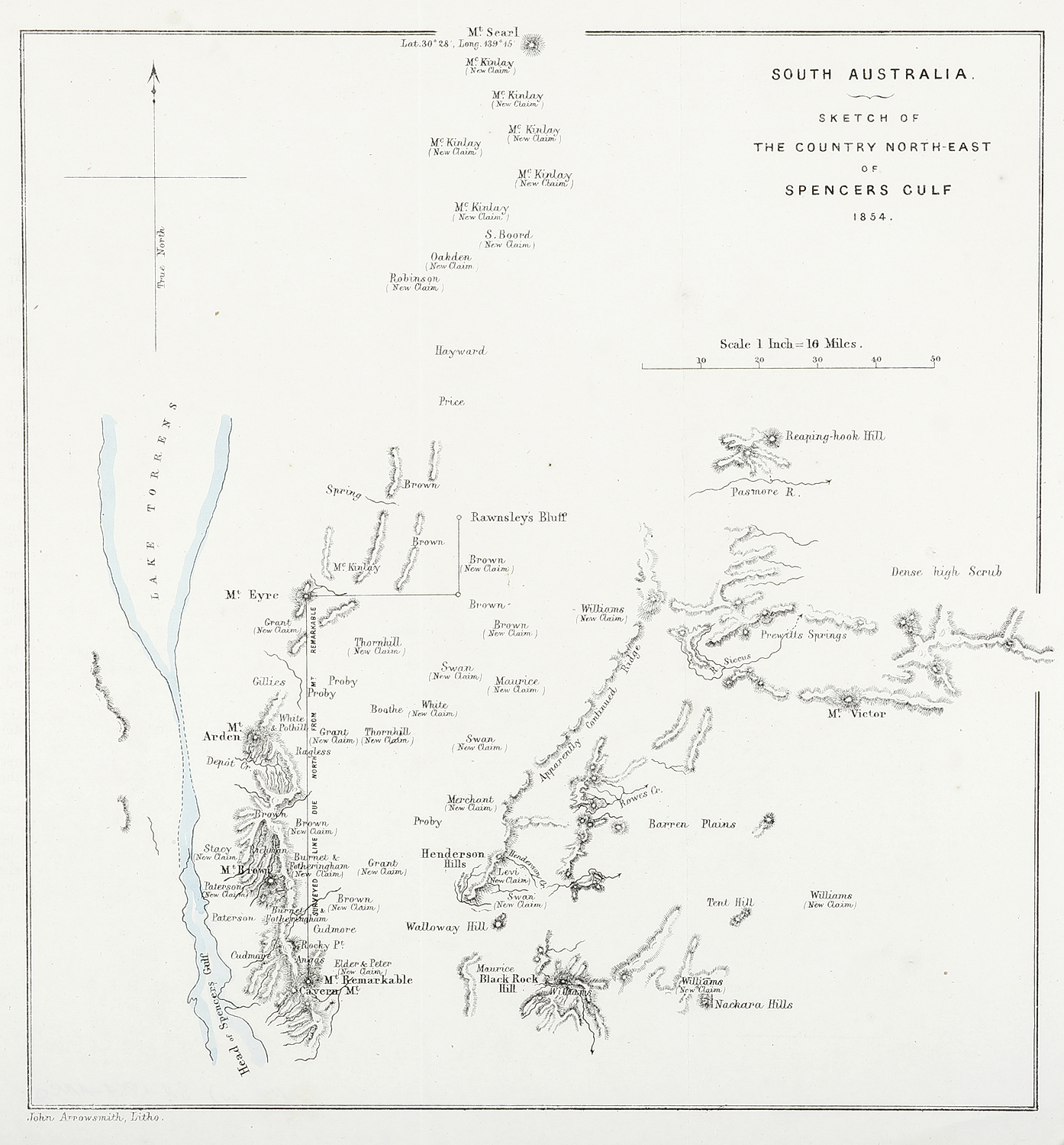 Many areas have been named and qualified as a new claim. The map also shows a survey line running north from Mount Remarkable to Mt. Eyre then east then north to Rawnsley’s Bluff.