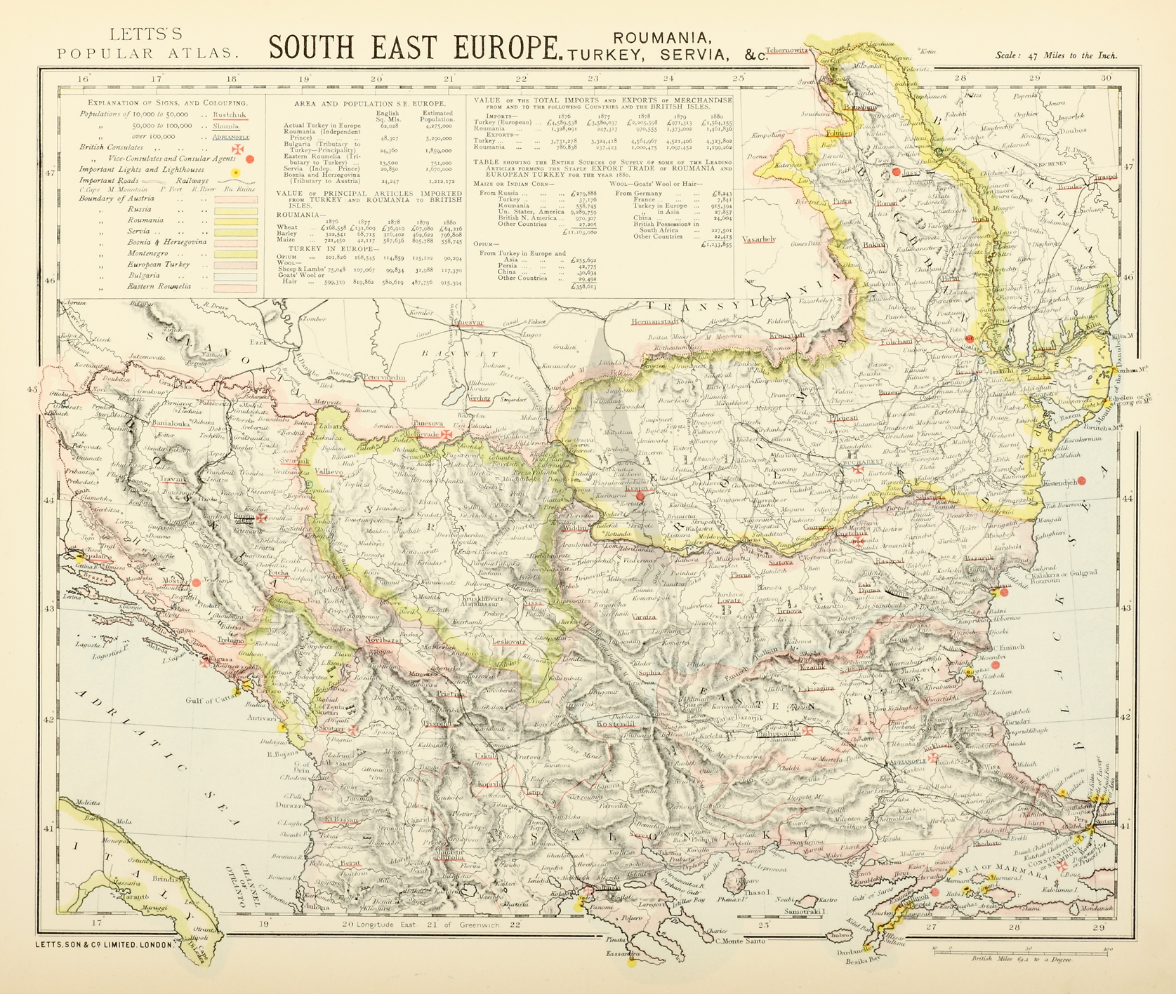 Detailed map of the Balkans from Lett’s Popular Atlas published Letts, Son &amp Co originally begun by Thomas Letts (1803&#82111873) an English stationer and printer who popularised the diary. In 1816, his father published &#8216Letts’s diary or bills owed book and almanack&#8217 as the first commercially produced diary, which Thomas developed into of dozens of differently printed and bound, annual publications. Thomas was joined in the family business by his son, Charles, and together they raised capital for expansion into a limited company in 1870, trading as ‘Letts, Son &amp Co.’ However Thomas died soon afterwards, being buried in West Norwood Cemetery in a Grade II listed monument. Charles reformed the company privately as Charles Letts &amp Co., trading profitably for the next century.