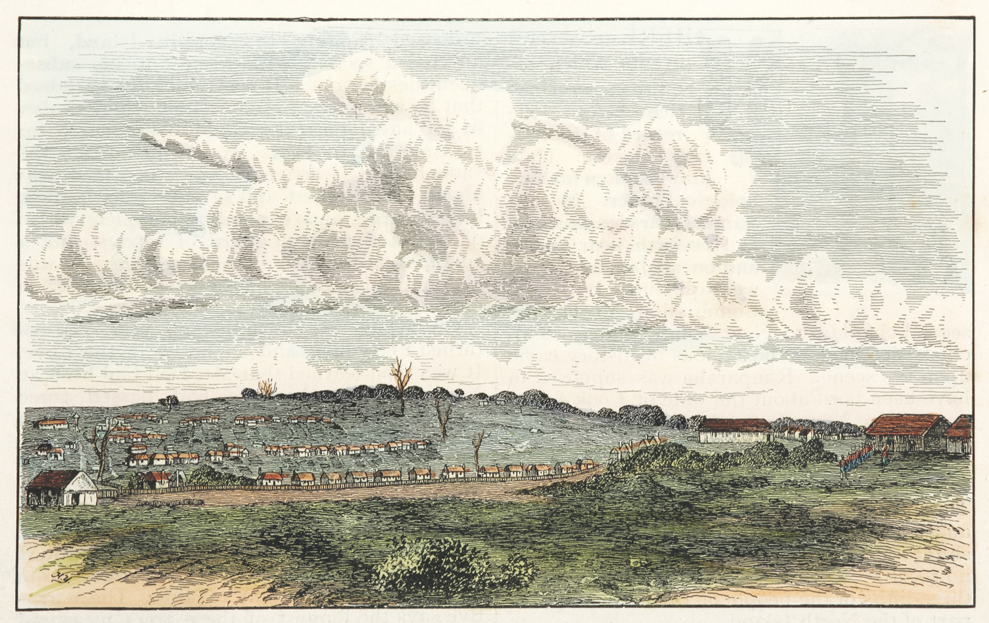 Engraved view of Sydney taken from the junction of York and Grosvenor Streets looking south east across George Street to Castlereagh Street.