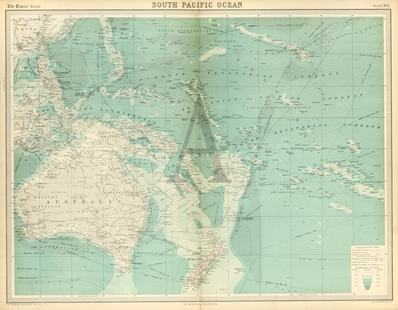 Very detailed map of the Pacific which includes railways, submarine cables, steamer routes, sea depths, heights of islands and rocks and shoals.