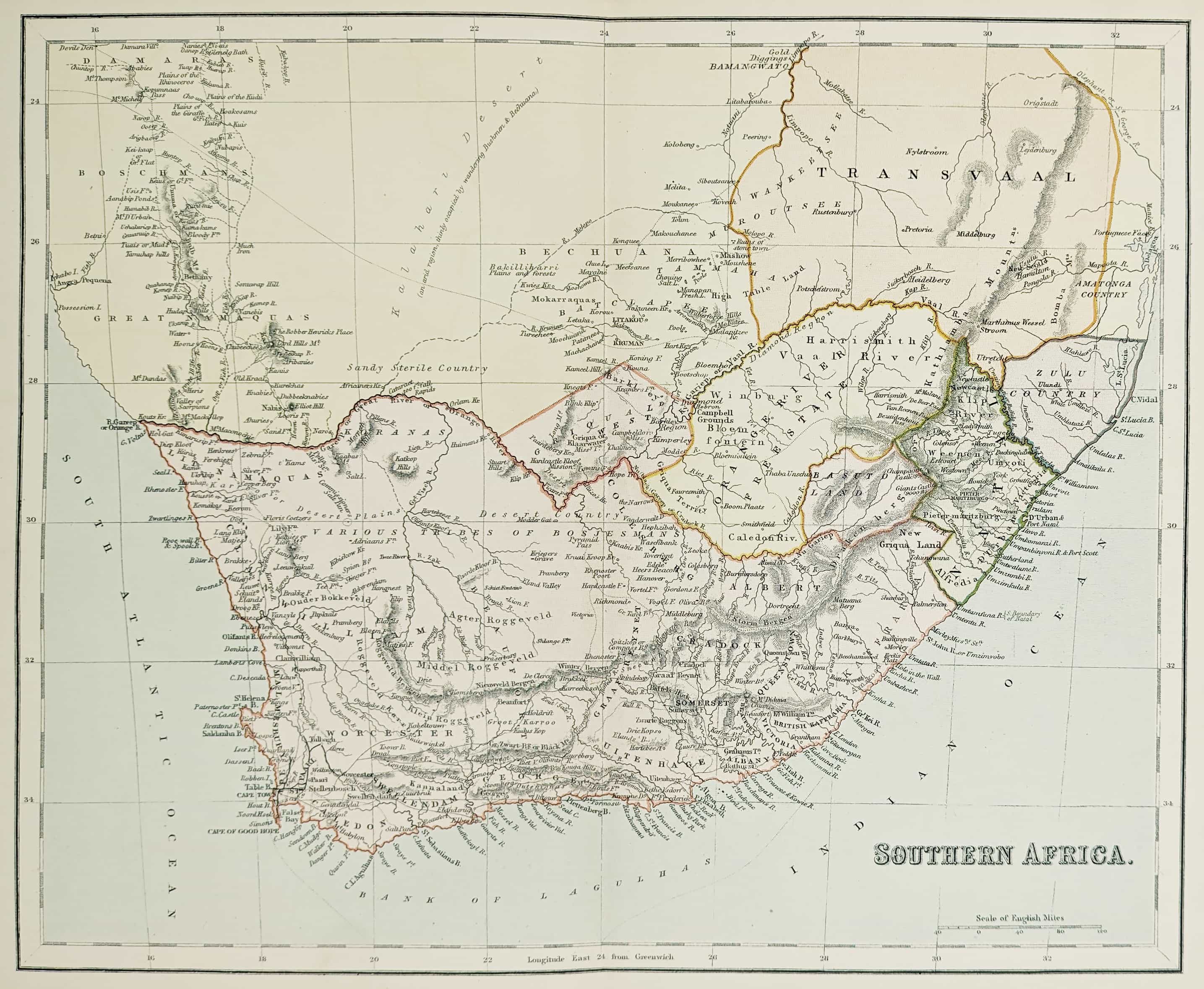 Detailed c.19th map of South Africa with countries coloured. Collections: National Library Australia: Bib ID: 1774031 State Library Victoria: Record ID 993984943607636 University of Edinburgh: LC : lc 05014918 British Library London: 002500854