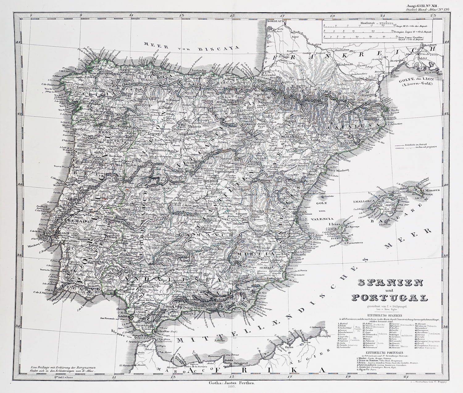 Very detailed German c.19th map of Spain and Portugal from the 3rd edition of Stielers Handatlas.