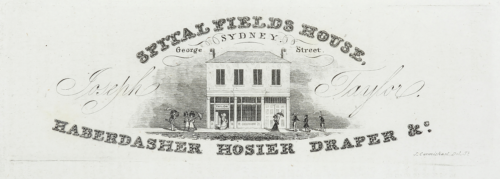 Very rare, early c.19th etching for Joseph Taylor’s haberdasher Spitalfields House, George Street, Sydney by John Black Carmichael (1811-1857)