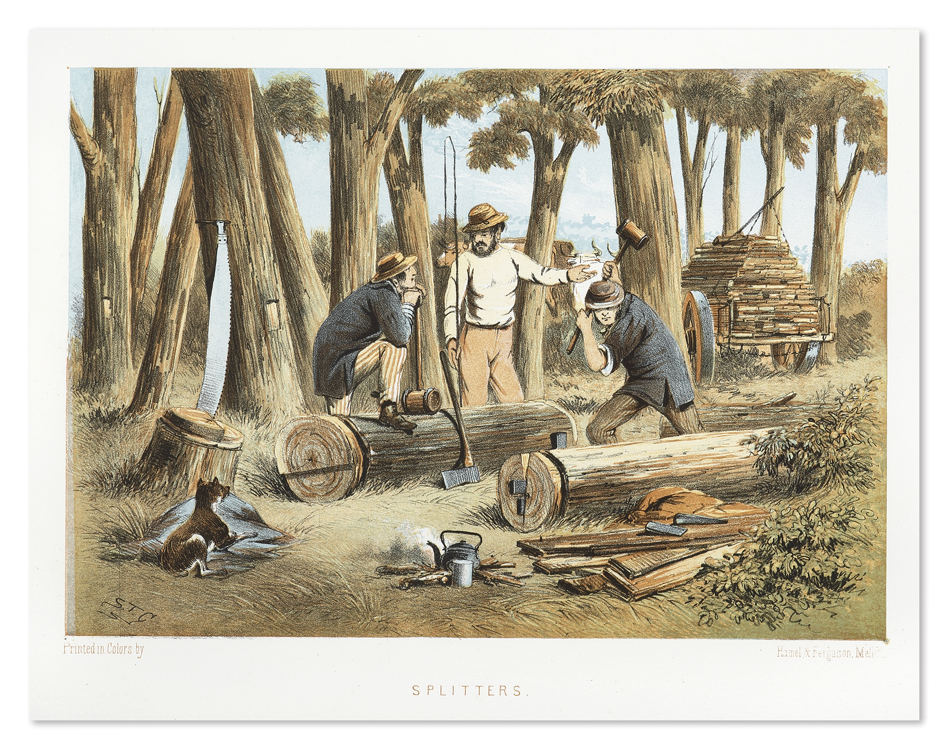 Lithograph of timber splitters at work in the bush by Samuel Thomas Gill.