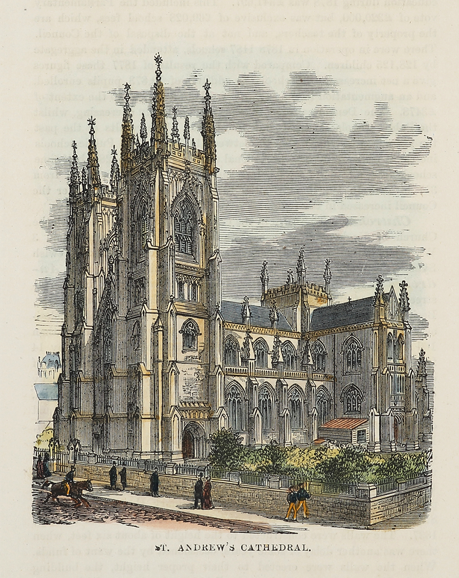 Scarce c.19th hand coloured engraving of St. Andrew’s Cathedral, Sydney.