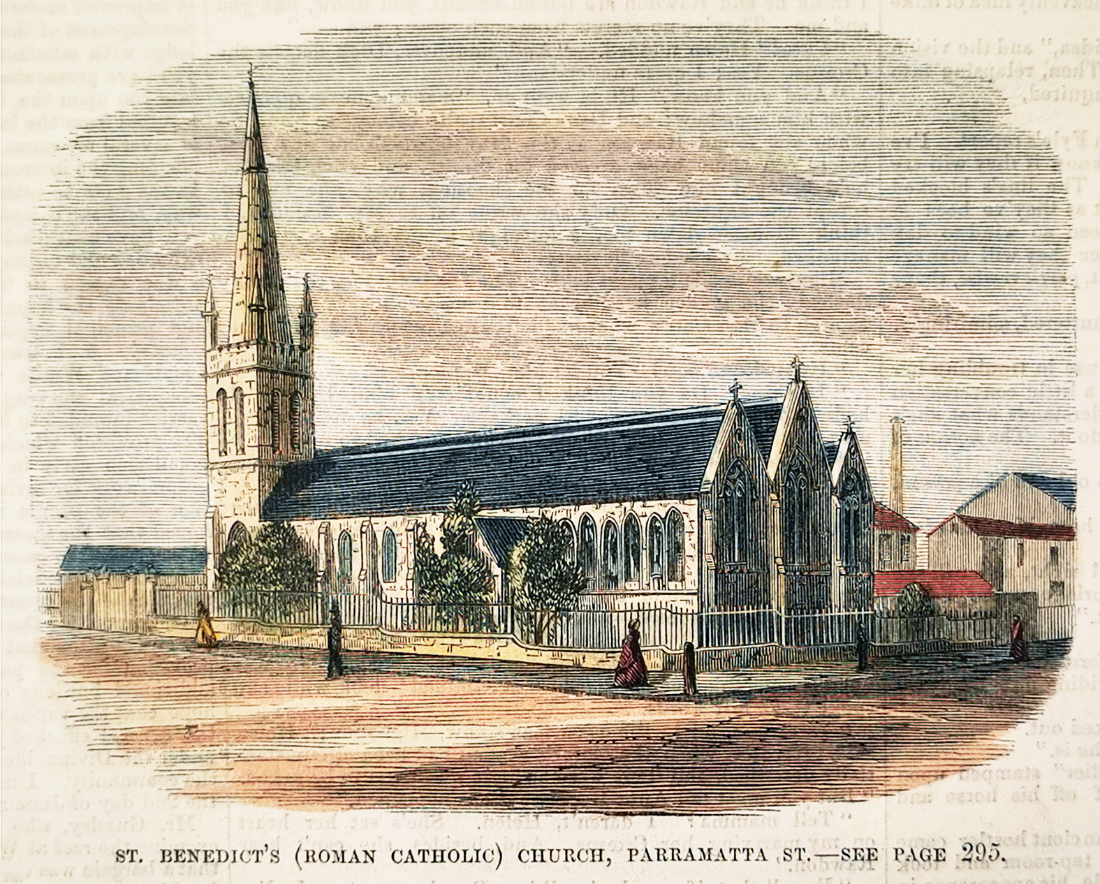 Engraving of Saint Benedict’s Church in Parramatta, Sydney.