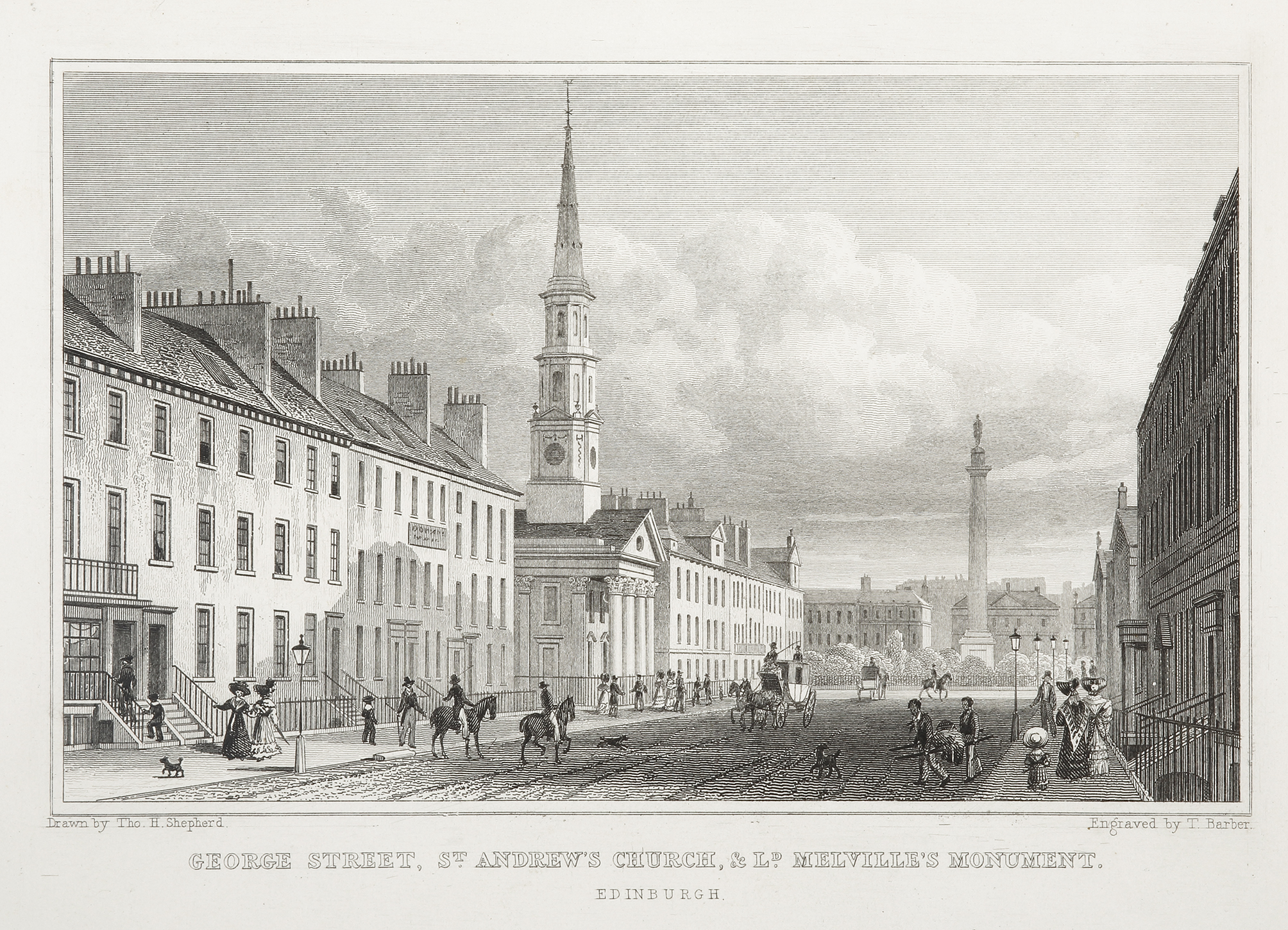 George Street, St.Andrew's Church, &Ld.Melville's Monument. Edinburgh. - Antique Print from 1829