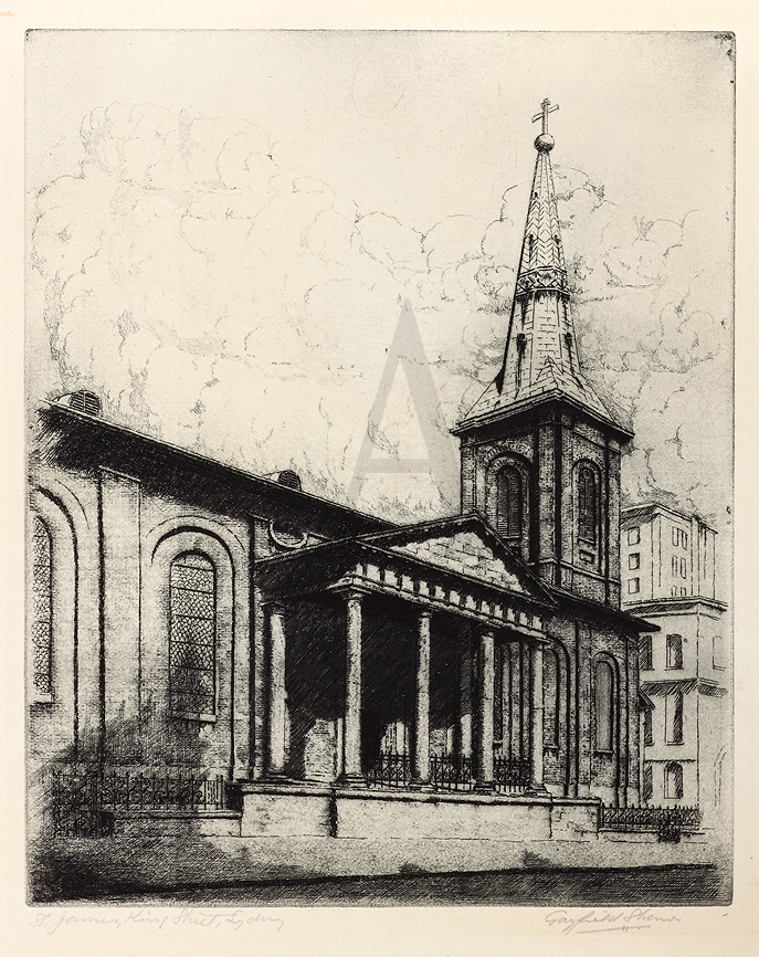 Fine etching by Gayfield Shaw of St James Church looking southwest from King Street. Originally intended to be a court house, the building was commissioned by Governor Lachlan Macquarie in 1819 and designed by the convict architect Francis Greenway. It … Read Full Description
